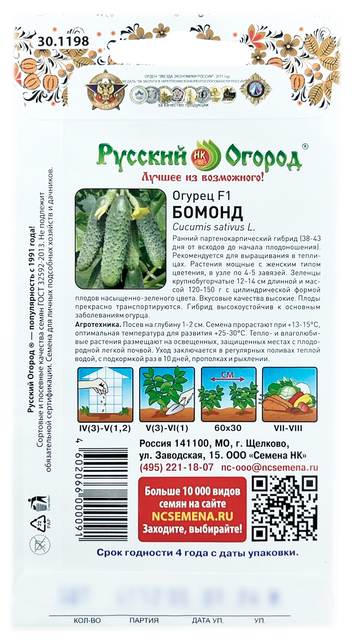 Огурец БОМОНД Русский ОгородРанний партенокарпический гибрид (38-43 дня от всходов до начала плодоношения). Рекомендуется для выращивания в теплицах. Растения мощные с женским типом цветения, в узле по 4-5 завязей. Зеленцы крупнобугорчатые 12-14 см длинной и массой 120-150 г с цилиндрической формой плодов насыщенно-зеленого цвета. Вкусовые качества высокие. Плоды прекрасно транспортируются. Гибрид высокоустойчив к основным заболеваниям огурца.
