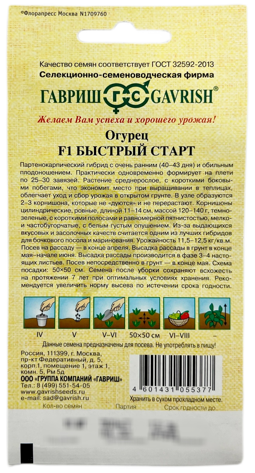Огурец Быстрый старт F1 ГАВРИШПартенокарпический гибрид, очень раннего (40-43 дня) и обильного плодоношения. Практически одновременно формирует на плети по 20-30 ззавязей. Растение среднерослое, с короткими боковыми побегами, что экономит место при выращивании в теплицах, облегчает уход и сбор урожая в открытом грунте. В узле образуются 2-3 корнишона, которые не «дуются» и не перерастают. Корнишоны цилиндрические, ровные, длиной 11-14 см, массой 120-140 г, тёмно-зелёные, с короткими полосами и равномерной пятнистостью, мелко- и частобугорчатые, с белым, густым опушением. Из-за выдающихся вкусовых и засолочных качеств считается одним из лучших гибридов для бочкового посола и маринования. Урожайность 11,5-12,5 кг/м2. Посев на рассаду — в конце апреля. Высадка рассады в грунт — в конце мая – начале июня. Высадка рассады производится в фазе 3-4-х настоящих листьев. Посев непосредственно в теплицу — в середине мая. Схема посадки: 50х50 см.
