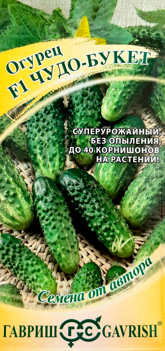 Огурец ЧУДО БУКЕТ F1 ГАВРИШНовый суперурожайный партенокарпический гибрид для выращивания в открытом грунте и пленочных теплицах. Через 42-46 дней на растении одновременно наливаются 30-40 аккуратных плодов, в букетах по 3-5 шт. в узле. Важной особенностью гибрида является продолжительное плодоношение, благодаря этому обильный урожай можно будет собирать с июня до осени. Зеленец цилиндрический, короткий, длиной 10-12 см, диаметром 3-4 см, массой 90-100 г, тёмно-зелёный, средне- и частобугорчатый, белошипый. Ровненькие всегда сладкие и хрустящие корнишоны удобно использовать для засолки в небольших банках и приготовления аппетитных свежих салатов. Урожайность 12,3-13,5 кг/м2. Гибрид устойчив к основным заболеваниям огурцов. Посев на рассаду — в конце апреля. Высадка рассады в грунт — в конце мая – начале июня в фазе 3-4-х настоящих листьев. Посев непосредственно в грунт – в мае – июне. Схема посадки: 50х50 см.