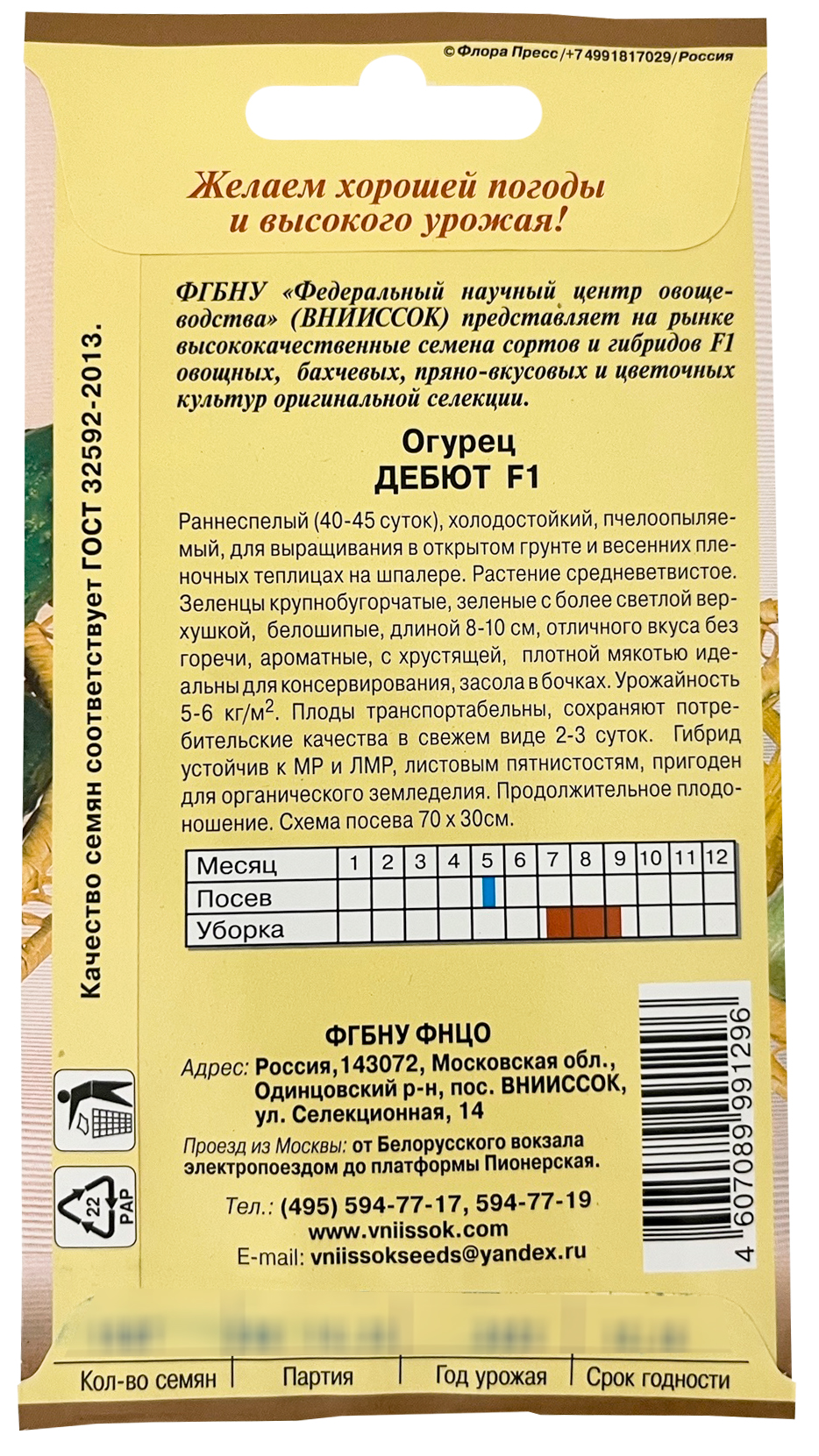 Огурец Дебют F1Урожайный пчёлоопыляемый гибрид для открытого грунта и весенних плёночных теплиц. Скороспелый, начинает плодоносить на 45-48 сутки от появления всходов. Растения преимущественно женского и смешанного типов цветения, ветвление среднее, длина главного стебля до 65 см. Плод с крупнобугорчатой поверхностью, белоопушённый, массой 60-70 г, длиной 10-12 см. Плод эллипсовидный, зелёный с белыми полосами. Ценится за хорошее качество плодов, которые не содержат горечи и пригодны для всех видов переработки. Гибрид устойчив к оливковой и угловатой пятнистостям, настоящей мучнистой росе, вынослив к поражению ложной мучнистой росой.