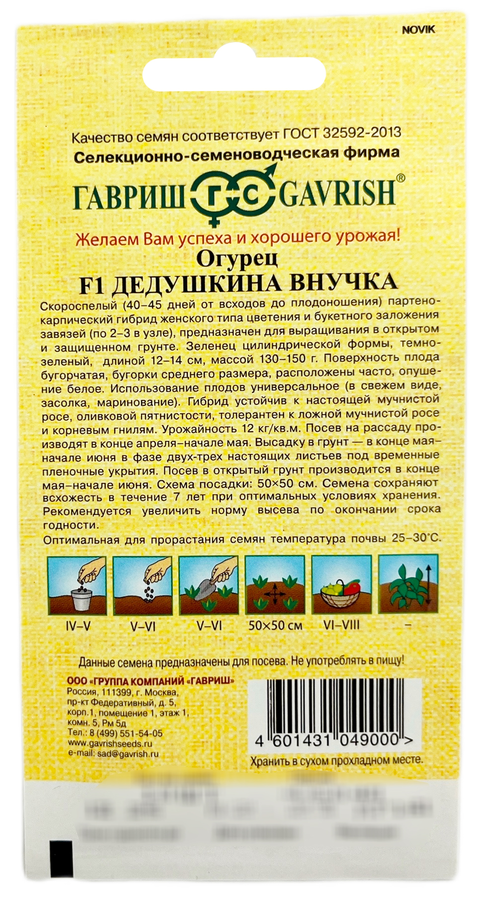 Огурец Дедушкина внучка F1 ГАВРИШСкороспелый (40-45 дней от всходов до плодоношения) партенокарпический гибрид женского типа цветения и букетного заложения завязей (по 2-3 в узле), предназначен для выращивания в открытом и защищенном грунте. Зеленец цилиндрической формы, темно-зеленый, длиной 12-14 см, массой 130-150 г. Поверхность плода бугорчатая, бугорки среднего размера, расположены часто, опушение белое. Использование плодов универсальное (в свежем виде, засолка, маринование). Гибрид устойчив к настоящей мучнистой росе, оливковой пятнистости, толерантен к ложной мучнистой росе и корневым гнилям. Урожайность 12 кг/м?. Посев на рассаду производят в конце апреля – начале мая. Высадку в грунт — в конце мая - начале июня в фазе двух-трех настоящих листьев под временные пленочные укрытия. Посев в открытый грунт производится в конце мая - в начале июня. Схема посадки: 50х50 см. Оптимальная для прорастания семян температура почвы 25-30°C.