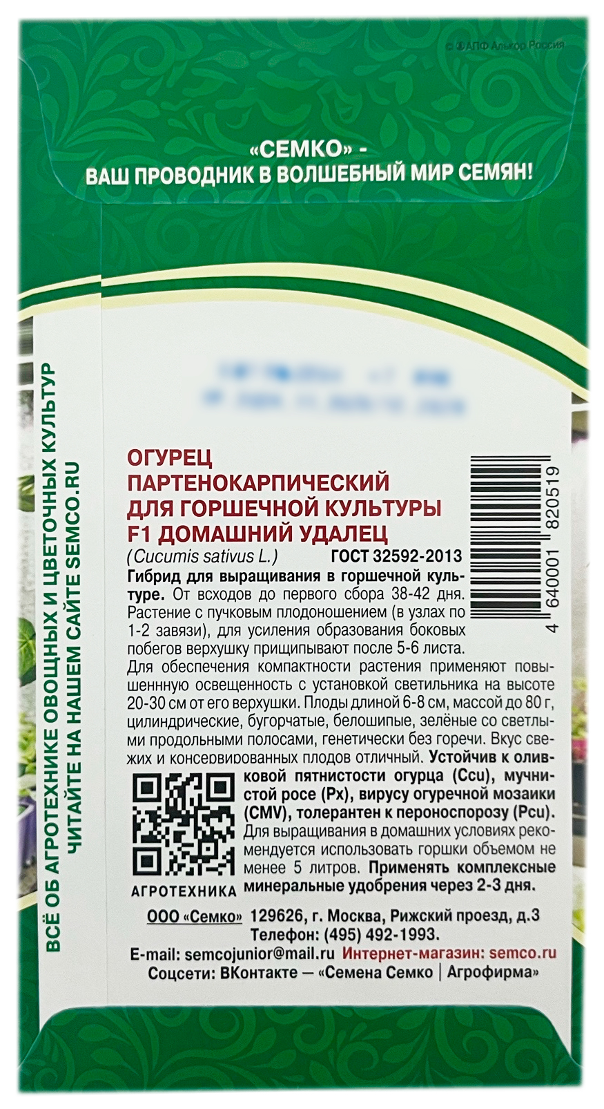 Огурец партенокарпический для горшечной культуры F1 ДОМАШНИЙ УДАЛЕЦ СЕМКООгурец Домашний Удалец F1 - гибрид для выращивания в горшечной культуре. От всходов до первого сбора 38-42 дня. Растение с пучковым плодоношением (в узлах 1-2 завязи), для усиления образования боковых побегов верхушку прищипывают после 5-6 листа. Для обеспечения компактности растения применяют повышеннную освещенность с установкой светильника на высоте 20-30 см от его верхушки. Плоды длиной 6-8 см, массой до 80 г, цилиндрические, бугорчатые, белошипые, зелёные со светлыми продольными полосами, генетически без горечи. Вкус свежих и консервированных плодов отличный. Огурец Домашний Удалец F1 устойчив к оливковой пятнистости огурца (Ccu), мучнистой росе (Px), вирусу огуречной мозаики (CMV), толерантен к пероноспорозу (Pcu). Для выращивания в домашних условиях рекомендуется использовать горшки объемом не менее 5 литров.