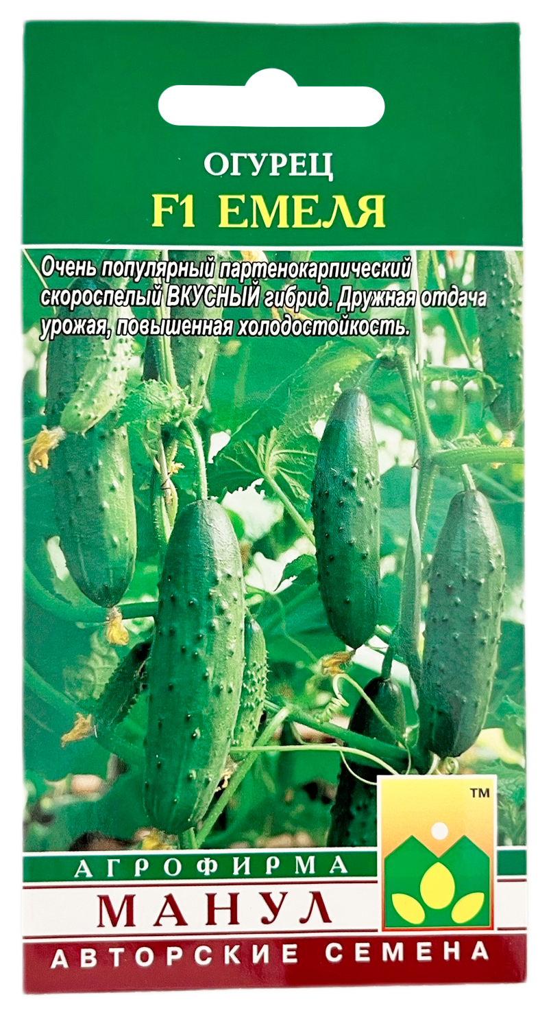 Огурец F1 Емеля МАНУЛСкороспелый урожайный партенокарпический гибрид женского или преимущественно женского типа цветения для весенних теплиц, тоннелей, открытого грунта. Растения сильнорослые, с укороченными междоузлиями; ветвление среднее или ниже среднего. Зеленцы интенсивно-зеленого цвета, крупнобугорчатые белошипые, овально-цилиндрической формы, длиной 13-15 см, очень высоких вкусовых качеств, хороши для засолки и консервирования. Для гибрида характерны дружная отдача урожая и повышенная холодостойкость. Урожайность F1 Емеля, несмотря на более короткие зеленцы, держится на уровне гибридов Зозуля и Апрельский, а в годы с ненастным летом превосходит их. Гибрид устойчив к оливковой пятнистости, вирусу обыкновенной огуречной мозаики, толерантен к корневым гнилям и мучнистой росе. Плотность посадки в теплицах 2,5 раст./м2, в открытом грунте 3-4 раст./м2.