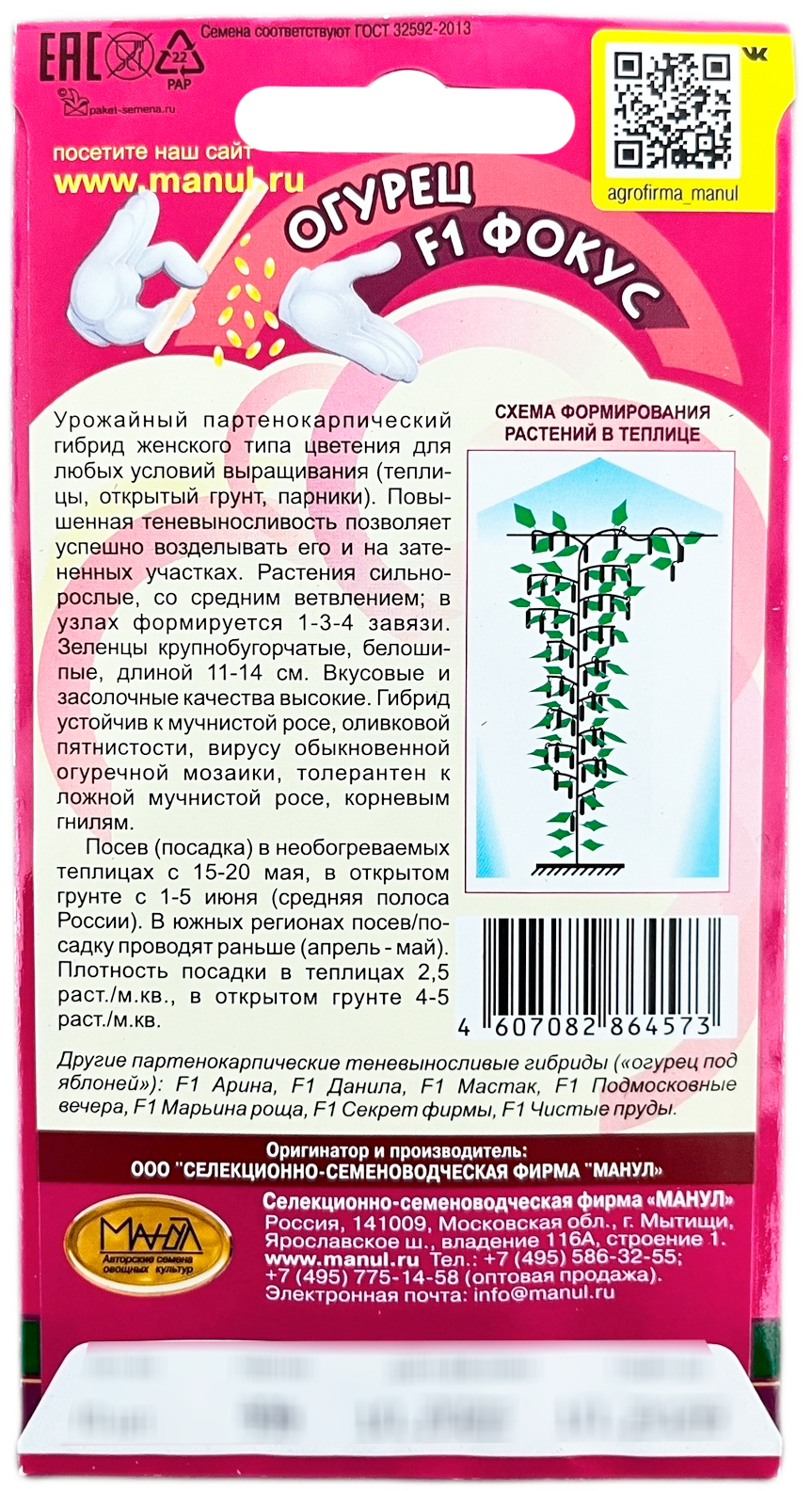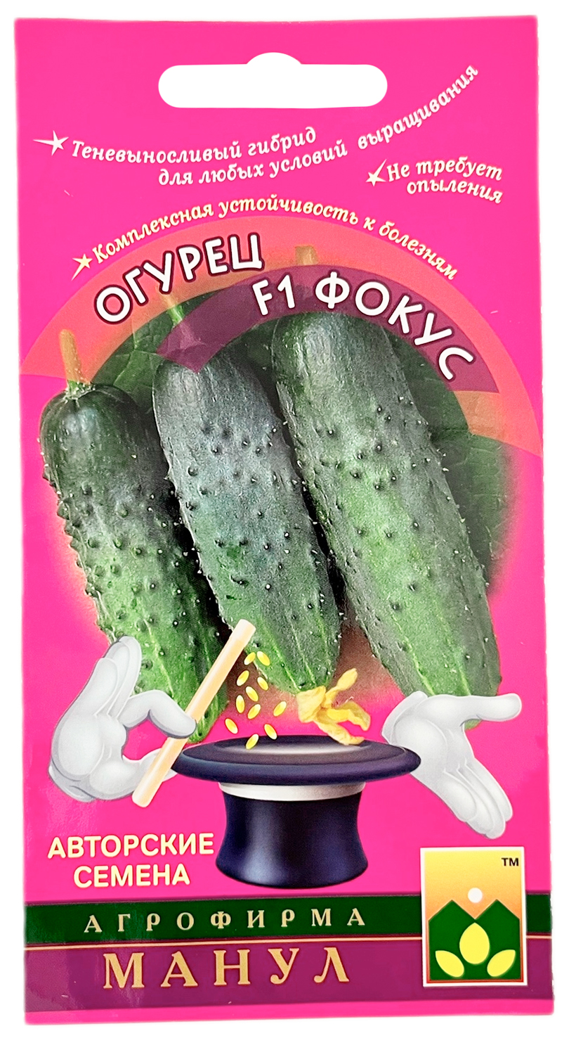 Огурец F1 Фокус МАНУЛПартенокарпический сильнорослый гибрид женского типа цветения. Предназначен для выращивания в весенних теплицах и открытом грунте, а также во втором обороте в обогреваемых теплицах (июль – октябрь). Ветвление среднее. В узлах формируется по 1-3-4 завязи. Зеленцы крупнобугорчатые, белошипые, длиной 11-14 см, диаметром 3,2-4,0 см, массой 110-120 г. Частота расположения бугорков средняя. Вкусовые и засолочные качества высокие. Теневынослив. Гибрид устойчив к оливковой пятнистости, вирусу обыкновенной огуречной мозаики, мучнистой росе, толерантен к ложной мучнистой росе, корневым гнилям. Плотность посадки в теплицах 2,5 раст./м2, в открытом грунте 3-4 раст./м2.