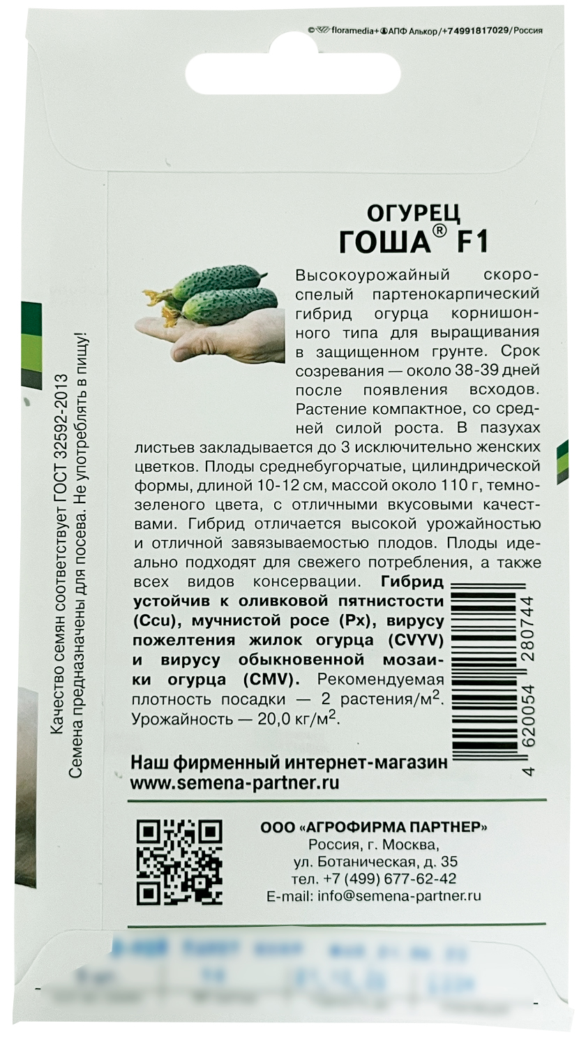Огурец Гоша F1Высокоурожайный скороспелый партенокарпический гибрид огурца корнишонного типа для выращивания в защищенном грунте. Срок созревания около 38-39 дней после появления всходов.
