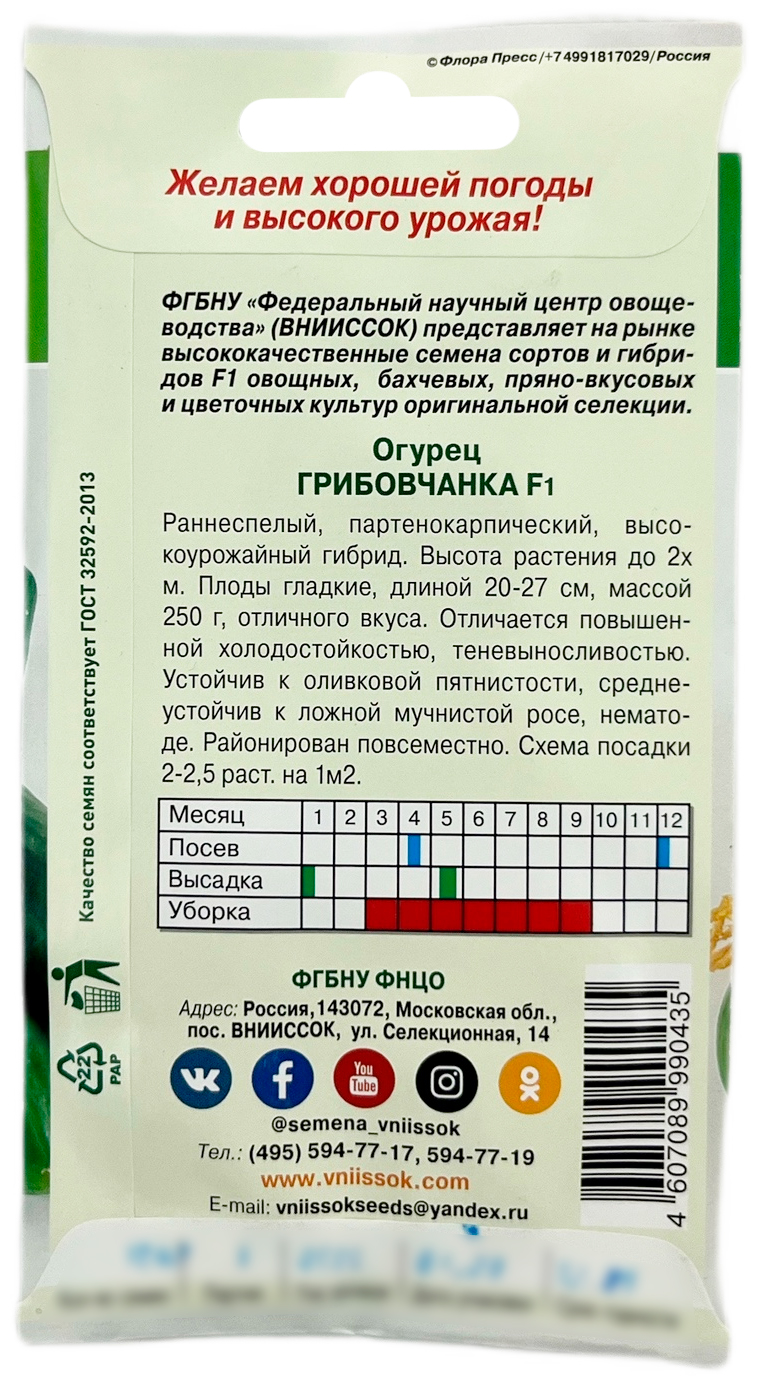 Огурец Грибовчанка F1 ВНИИССОКПартенокарпический гибрид для зимне-весеннего оборота зимних теплиц, скороспелый, высокоурожайный. Растения преимущественно женского типа цветения, обладают хорошей теневыносливостью и пригодны для самых ранних посадок, средневетвистые. Плоды очень вкусные, характеризуются отсутствием горечи при любых погодных условиях. Опушение завязи белое, поверхность плода гладкая, блестящая, масса товарного плода 250-260 г, длина плода 22-25 см. Гибрид характеризуется повышенной устойчивостью к корневым гнилям, аскохитозу, высокой устойчивостью к оливковой пятнистости. Урожайность гибрида 28,2 кг/м2. Ценным свойством является повышенная холодостойкость и способность переносить резкие колебания температуры, которые часто наблюдаются в теплицах.