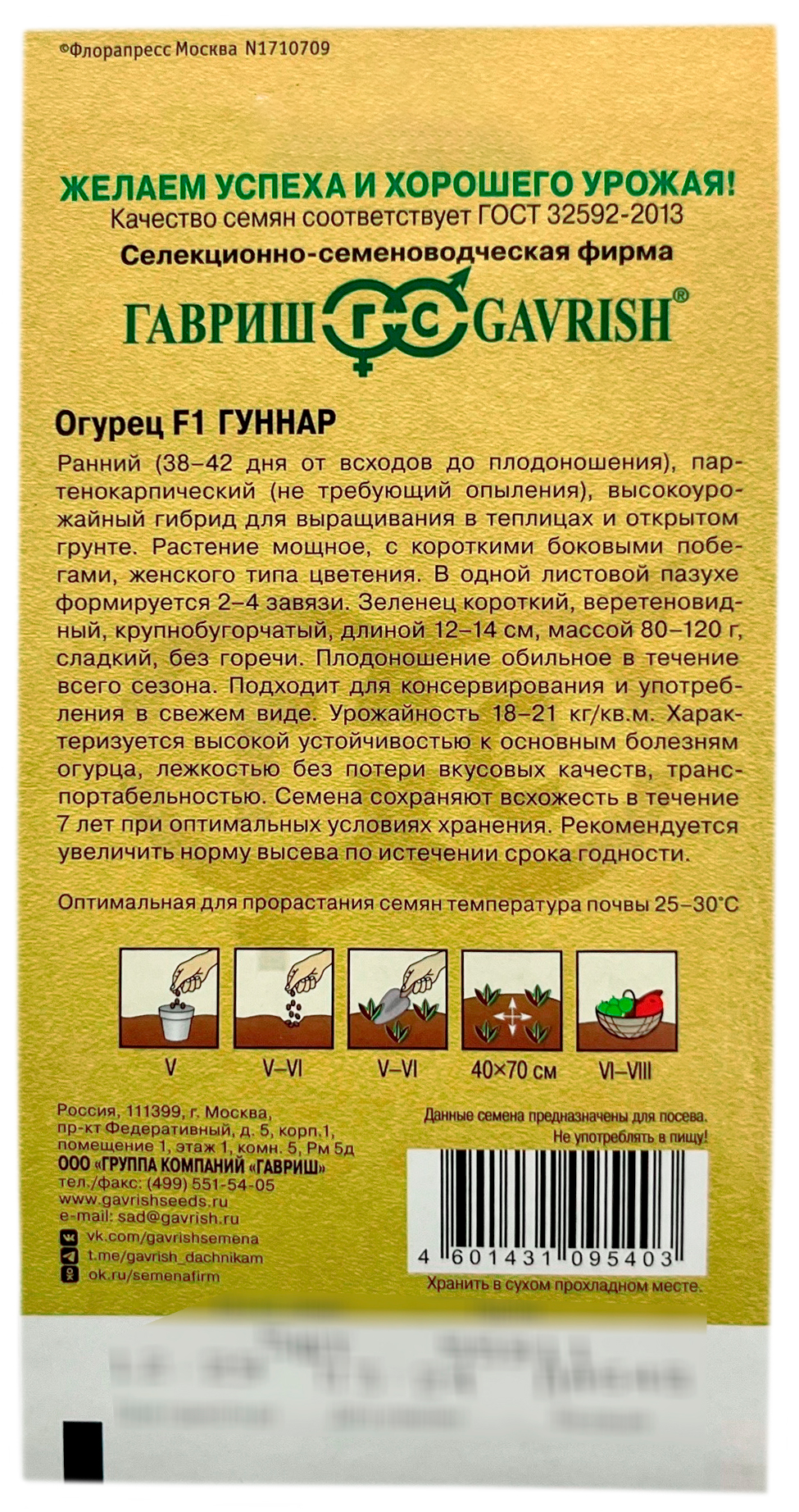 Огурец ГУННАР F1 ГАВРИШСуперранний (38-42 дня от всходов до плодоношения), партенокарпический (не требующий опыления), высокоурожайный гибрид для выращивания в теплицах и открытом грунте. Растение мощное, с короткими боковыми побегами, женского типа цветения. В одной листовой пазухе формируется 2–4 завязи. Зеленец короткий, веретеновидный, крупнобугорчатый, длиной 12-14 см, массой 80-120 г, сладкий, без горечи. Плодоношение обильное в течение всего сезона. Подходит для консервирования и употребления в свежем виде. Урожайность 18-21 кг/ м2. Характеризуется высокой устойчивостью к основным болезням огурца, лежкостью без потери вкусовых качеств, транспортабельностью. Семена после уборки сохраняют всхожесть в течение 7 лет при оптимальных условиях хранения. Рекомендуется увеличить норму высева по окончании срока годности.