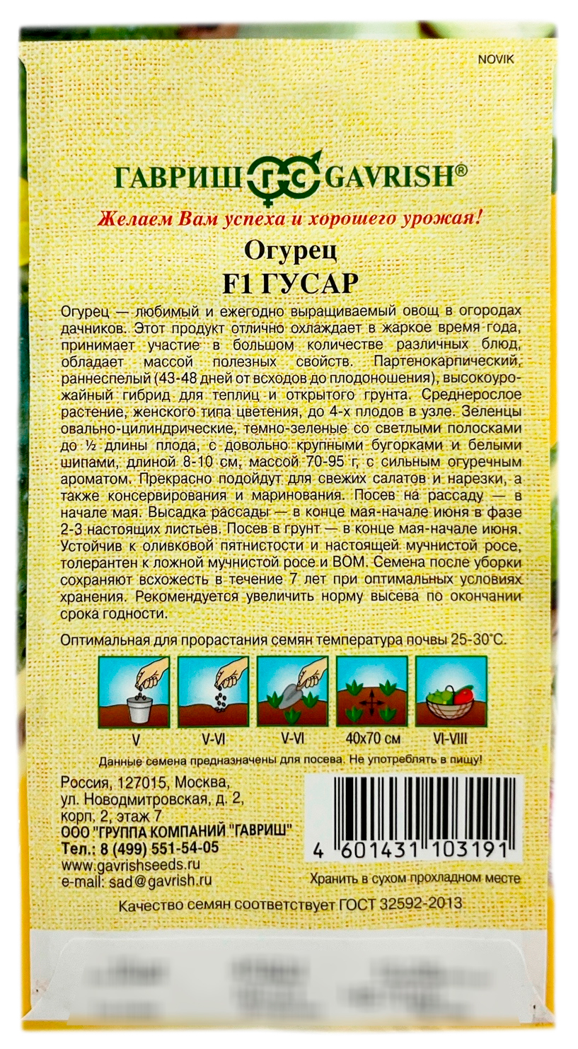 Огурец ГУСАР F1 ГАВРИШОгурец — любимый и ежегодно выращиваемый овощ в огородах дачников. Этот продукт отлично охлаждает в жаркое время года, принимает участие в большом количестве различных блюд, обладает массой полезных свойств. Партенокарпический, раннеспелый (43-48 дней от всходов до плодоношения), высокоурожайный гибрид для теплиц и открытого грунта. Среднерослое растение, женского типа цветения, до 4-х плодов в узле. Зеленцы овально-цилиндрические, темно-зеленые со светлыми полосками до ½ длины плода, с довольно крупными бугорками и белыми шипами, длиной 8-10 см, массой 70-95 г, с сильным огуречным ароматом. Прекрасно подойдут для свежих салатов и нарезки, а также консервирования и маринования. Посев на рассаду — в начале мая. Высадка рассады — в конце мая-начале июня в фазе 2-3-х настоящих листьев. Посев в грунт — в конце мая-начале июня. Устойчив к оливковой пятнистости и настоящей мучнистой росе, толерантен к ложной мучнистой росе и ВОМ. Семена после уборки сохраняют всхожесть в течение 7 лет при оптимальных условиях хранения. Рекомендуется увеличить норму высева по окончании срока годности.