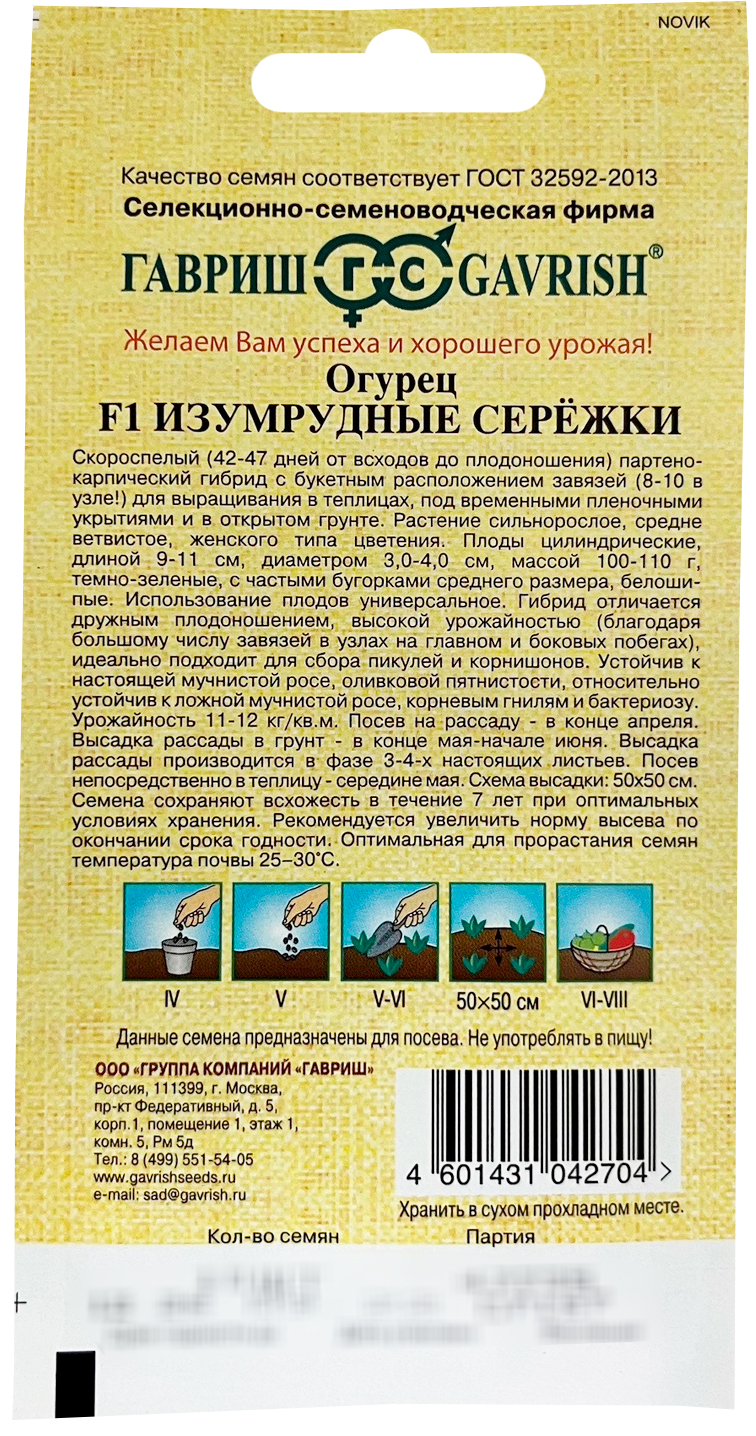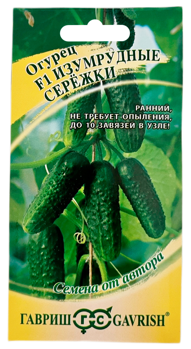 Огурец Изумрудные сережки F1 ГАВРИШСкороспелый (42-47 дней от всходов до плодоношения) партенокарпический гибрид с букетным расположением завязей (8-10 в узле!) для выращивания в теплицах, под временными пленочными укрытиями и в открытом грунте. Растение сильнорослое, средневетвистое, женского типа цветения. Плоды цилиндрические, длиной 9-11 см, диаметром 3,0-4,0 см, массой 100-110 г, темно-зеленые, с частыми бугорками среднего размера, белошипые. Использование плодов универсальное. Гибрид отличается дружным плодоношением, высокой урожайностью (благодаря большому числу завязей в узлах на главном и боковых побегах), идеально подходит для сбора пикулей и корнишонов. Устойчив к настоящей мучнистой росе, оливковой пятнистосли, относительно устойчив к ложной мучнистой росе, корневым гнилям и бактериозу.