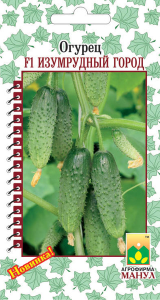 Огурец F1 Изумрудный город - очень скороспелый партенокарпический пучковый корнишонный гибрид женского типа цветения для защищенного и открытого грунта. Ветвление среднее. В узлах формируется от 2-3 до 5-6 завязей. Зеленцы бугорчатые, белошипые, длиной 9-12 см, диаметром 2,9-3,5 см, массой 90-110 гр., вкусные, хрустящие. Расположение бугорков частое. Консервные и засолочные качества высокие. Гибрид выделяется активным плодоношением в любых условиях выращивания, ровными красивыми зеленцами. Устойчив к оливковой пятнистости, вирусу обыкновенной огуречной мозаики, мучнистой росе, толерантен к ложной мучнистой росе. Посев/посадка в необогреваемых теплицах с 15-20 мая, в открытом грунте с 1-5 июня (средняя полоса России). В южных регионах посев/посадку проводят раньше (апрель — май). Плотность посадки в теплицах 2,5 раст./м кв., в открытом грунте 3-4 раст./м кв.Характеристики