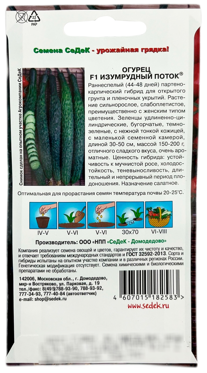 Огурец Изумрудный Поток F1 СеДеКРаннеспелый (44-48 дней) партенокарпический гибрид для открытого грунта и пленочных укрытий. Растение сильнорослое, слабоплетистое, преимущественно c женским типом цветения. Зеленцы удлиненно-цилиндрические, бугорчатые, темно-зеленые, с нежной тонкой кожицей, с маленькой семенной камерой, длиной 30-50 см, массой 150-200 г, отличного сладкого вкуса, очень ароматные. Ценность гибрида: устойчивость к мучнистой росе, холодостойкость, теневыносливость, длительный и непрерывный период плодоношения. Назначение салатное.