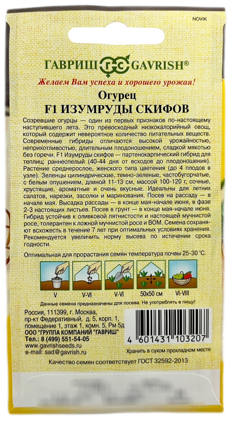Огурец Изумруды Скифов F1 ГАВРИШСозревшие огурцы — один из первых признаков по-настоящему наступившего лета. Это превосходный низкокалорийный овощ, который содержит невероятное количество питательных веществ. Современные гибриды отличаются высокой урожайностью, неприхотливостью, длительным плодоношением, сладкой мякотью без горечи. F1 Изумруды скифов — партенокарпический гибрид для теплиц; раннеспелый (40-44 дня от всходов до плодоношения). Растение среднерослое, женского типа цветения (до 4-х плодов в узле). Зеленцы цилиндрические, темно-зеленые, частобугорчатые с белым опушением, длиной 11-13 см, массой 100-120 г, сочные, хрустящие, ароматные и очень вкусные. Идеальны для летних салатов, нарезки, засолки и маринования. Посев на рассаду — в начале мая. Высадка рассады — в конце мая-начале июня в фазе 2-3-х настоящих листьев. Посев в грунт — в конце мая-начале июня. Гибрид устойчив к оливковой пятнистости и настоящей мучнистой росе, толерантен к ложной мучнистой росе и ВОМ. Семена после уборки сохраняют всхожесть в течение 7 лет при оптимальных условиях хранения. Рекомендуется увеличить норму высева по окончании срока годности.