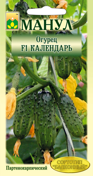 Огурец F1 Календарь — скороспелый партенокарпический корнишонный гибрид сортотипа Балконный, женского или преимущественно женского типа цветения с пучковым расположением завязей в узлах. Предназначен для выращивания в весенне-летнем обороте на балконах, лоджиях, верандах, открытом и защищенном грунте. Ветвление среднее. Междоузлия на основной плети и боковых побегах короткие. Листья некрупные. В узлах формируется от 2-3 до 5-6 и более завязей; на боковых побегах пучковость выражена сильнее, чем на основной плети. Зеленцы овально-веретеновидной формы, без ручки, интенсивно-зеленого цвета с продольными светлыми полосками средней длины. Зеленцы короткие, длиной 8-10 см, диаметром 3,0-3,5 см, массой 80-90 г., с глянцевой поверхностью. Частота расположения бугорков средняя, бугорки средней величины. Вкусовые и засолочные качества. Гибрид устойчив к оливковой пятнистости, вирусу обыкновенной огуречной мозаики, мучнистой росе, толерантен к ложной мучнистой росе.Характеристики