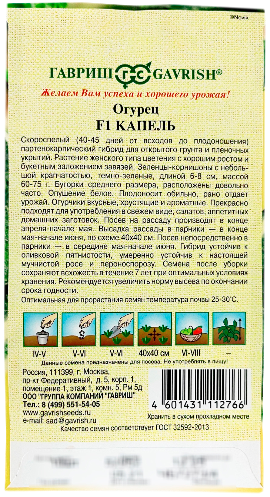 Огурец Капель F1 ГАВРИШСкороспелый (40-45 дней от всходов до плодоношения) партенокарпический гибрид для открытого грунта и пленочных укрытий. Растение женского типа цветения с хорошим ростом и букетным заложением завязей. Зеленцы-корнишоны с небольшой крапчатостью, темно-зеленые, длиной 6-8 см, массой 60-75 г. Бугорки среднего размера, расположены довольно часто. Опушение белое. Плодоносит обильно, рано отдает урожай. Огурчики вкусные, хрустящие и ароматные, прекрасно подходят для употребления в свежем виде, салатов, аппетитных домашних заготовок. Посев на рассаду производят в конце апреля - начале мая. Высадка рассады в парники — в конце мая-начале июня, по схеме 40х40 см. Посев непосредственно в парники — в середине мая-начале июня. Гибрид устойчив к оливковой пятнистости, умеренно устойчив к настоящей мучнистой росе и пероноспорозу. Семена после уборки сохраняют всхожесть в течение 7 лет при оптимальных условиях хранения. Рекомендуется увеличить норму высева по окончанию срока годности.