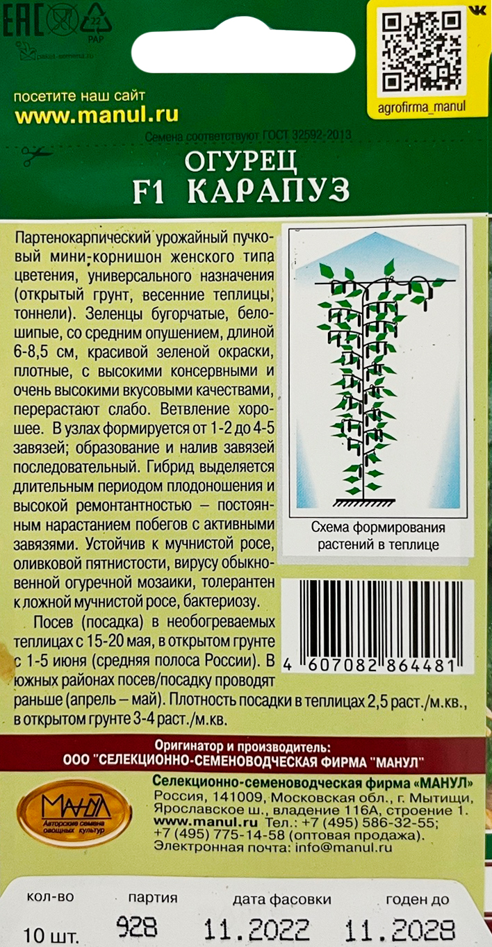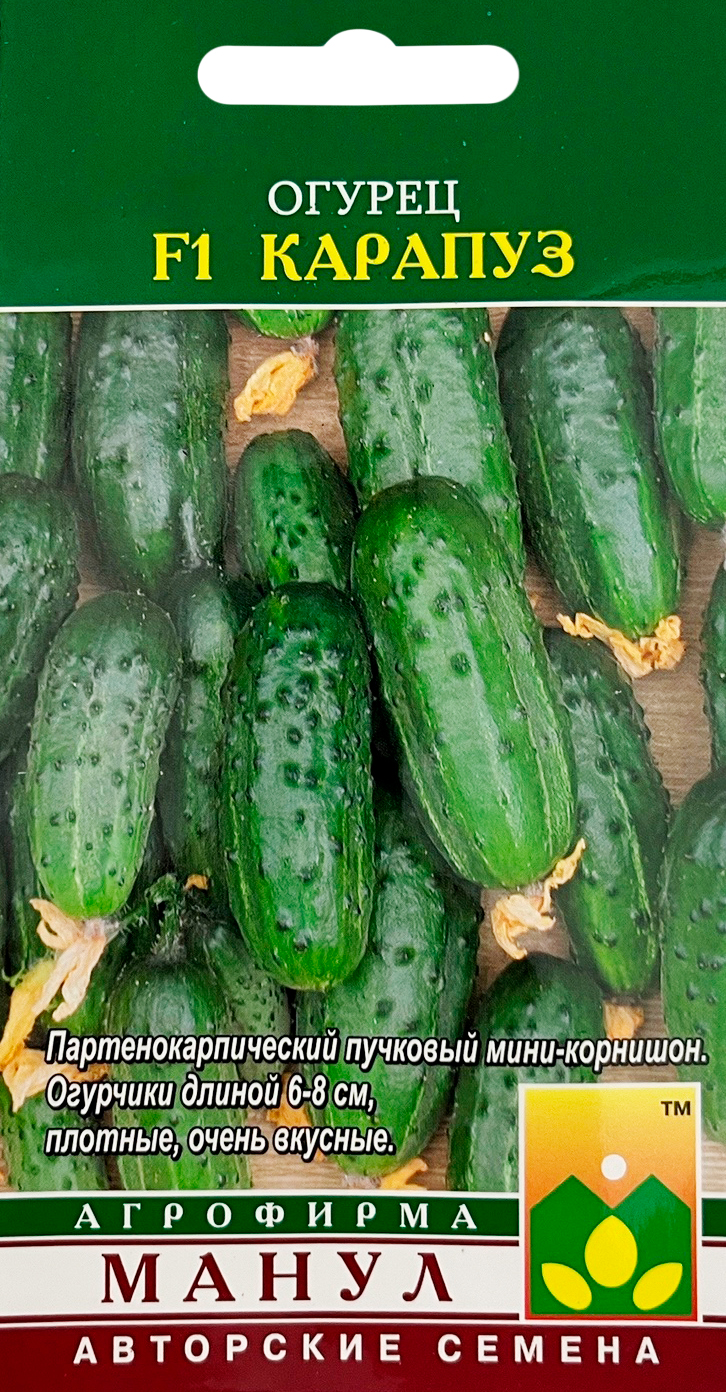 Огурец F1 КарапузПартенокарический урожайный пучковый мини-корнишон женского типа цветения, универсального назначения (открытый грунт, весенние теплицы, тоннели). Зеленцы бугорчатые, белошипые, со средним опушением, длиной 6-8,5 см, красивой зеленой окраски, плотные, с высокими консервными и очень высокими вкусовыми качествами, перерастают слабо. Ветвление хорошее. В узлах формируется от 1-2 до 4-5 завязей; образование и налив завязей последовательный. Гибрид выделяется длительным периодом плодоношения и высокой ремонтантностью — постоянным нарастанием побегов с активными завязями. Положительно реагирует на доопыление — повышается ранний и общий урожай. Более активный налив зеленцов проявляется при умеренной температуре воздуха; в условиях перегревов формирование плодов может ослабевать. Устойчив к мучнистой росе, оливковой пятнистости, вирусу обыкновенной огуречной мозаики, толерантен к ложной мучнистой росе, бактериозу. Плотность посадки в теплицах 2,5 раст./м2, в открытом грунте 3-4 раст./м2.