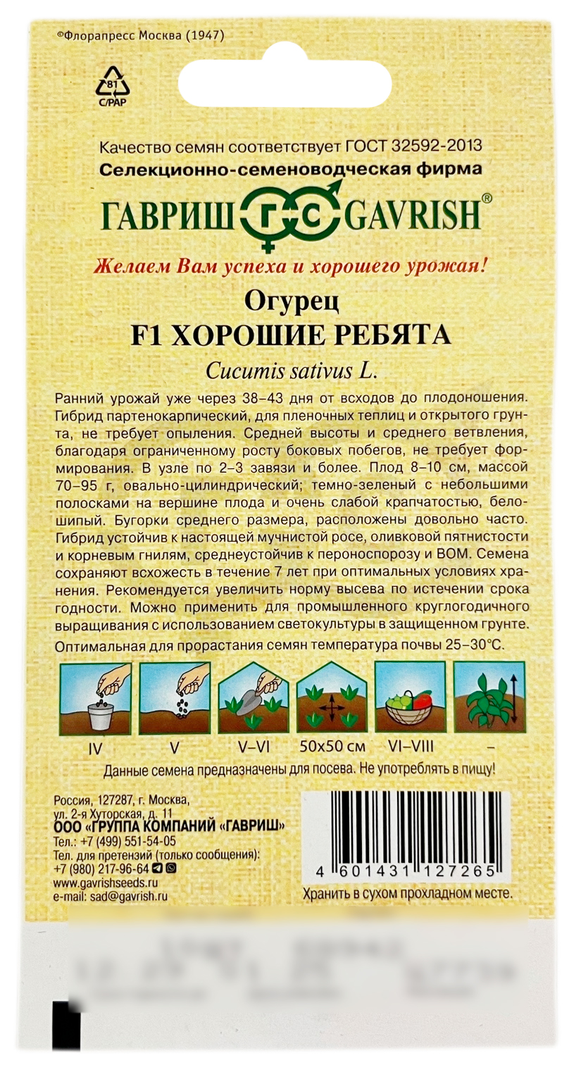 Огурец F1 ХОРОШИЕ РЕБЯТА ГАВРИШРанний урожай уже через 38-43 дня от всходов до плодоношения. Гибрид партенокарпический, для пленочных теплиц и открытого грунта, не требует опыления. Средней высоты и среднего ветвления, благодаря ограниченному росту боковых побегов, не требует формирования. В узле по 2-3 завязи и более. Плод 8-10 см, массой 70-95 г, овально-цилиндрический; темно-зеленый с небольшими полосками на вершине плода и очень слабой крапчатостью, белошипый. Бугорки среднего размера, расположены довольно часто. Гибрид устойчив к настоящей мучнистой росе, оливковой пятнистости и корневым гнилям, среднеустойчив к пероноспорозу и ВОМ. Семена сохраняют всхожесть в течение 7 лет при оптимальных условиях хранения. Рекомендуется увеличить норму высева по истечении срока хранения. Можно применить для промышленного круглогодичного выращивания с использованием светокультуры в защищенном грунте.