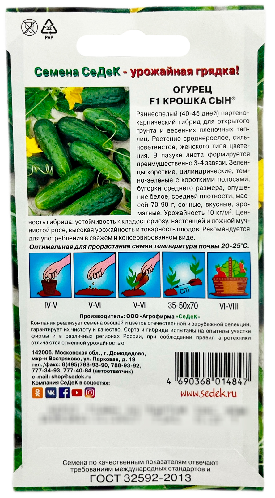 Огурец Крошка Сын F1 СеДеКРаннеспелый (40-45 дней) партенокарпический гибрид для открытого грунта и весенних пленочных теплиц. Растение среднерослое, сильноветвистое, женского типа цветения. В пазухе листа формируется преимущественно 3-4 завязи. Зеленцы короткие, цилиндрические, темно-зеленые с короткими полосами, бугорки среднего размера, опущение белое, средней плотности, массой 70-90 г, сочные, вкусные, ароматные. Урожайность 10 кг/м2. Ценность гибрида: устойчивость к кладоспориозу, настоящей и ложной мучнистой росе, высокая урожайность и товарность плодов. Рекомендуется для употребления в свежем и консервированном виде.