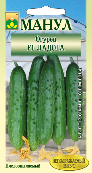 Огурец F1 Ладога - основной, урожайный, среднеспелый пчелоопыляемый гибрид с сильным проявлением женского пола. Характеризуется интенсивным ростом, начиная с фазы рассады. Обладает высоким потенциалом продуктивности. Зеленцы бугорчатые белошипые, длиной 16-18 см, ярко-зеленой окраски с продольными светлыми полосами. Форма зеленца от веретеновидной до цилиндрической, ручка выражена незначительно. Бугорки крупные, частота расположения бугорков редкая. Ветвление среднее. Гибрид с широким оптимальным температурным диапозоном, устойчив к оливковой пятнистости и вирусу обыкновенной огуречной мозаики.Характеристики