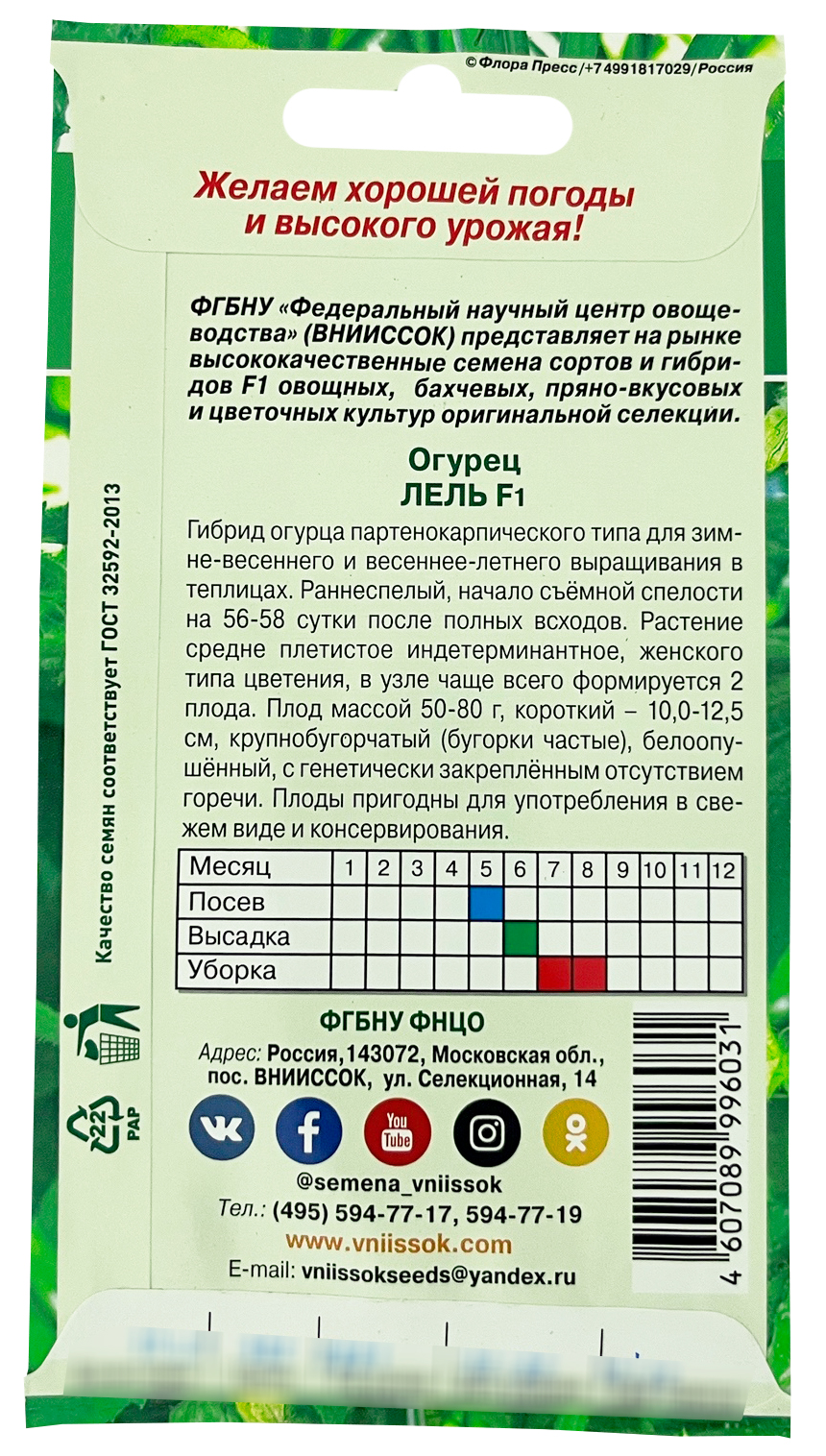 Огурец Лель F1 ВНИИССОКГибрид огурца партенокарпического типа для зимне-весеннего и весенне-летнего выращивания в теплицах. Раннеспелый, начало съемной спелости на 56-58 сутки после полных всходов. Растение средне плетистое индетерминантное, женского типа цветения, в узле чаще всего формируется 2 плода. Плод массой 50-80 г, короткий - 10-12,5 см, крупнобугорчатый (бугорки частые), белоопушённый, с генетически закрепленным отсутствием горечи. Плоды пригодны для употребления в свежем виде и консервации.
