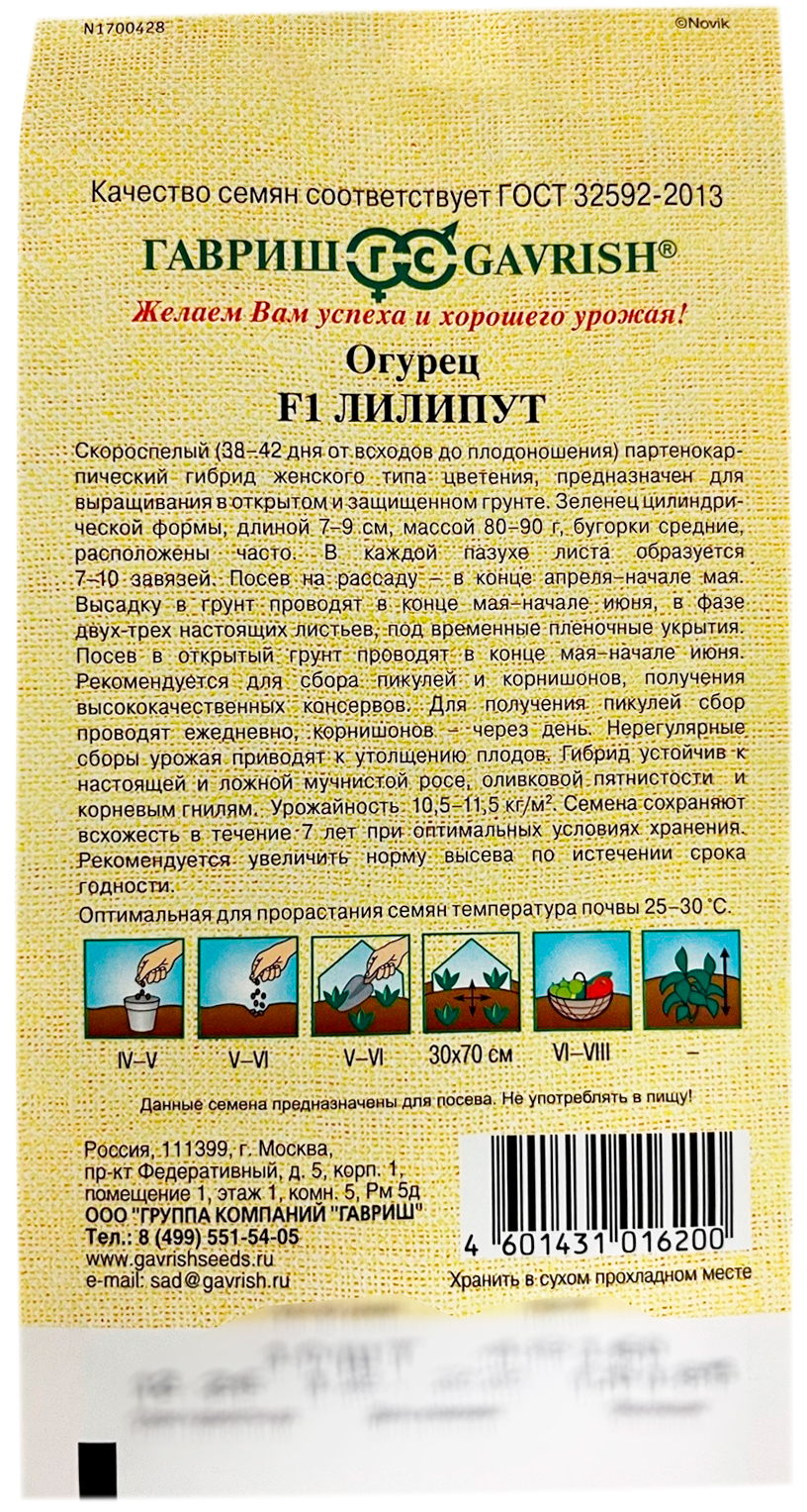 Огурец Лилипут F1 ГАВРИШСкороспелый (38-42 дня от всходов до плодоношения) партенокарпический гибрид женского типа цветения, предназначен для выращивания в открытом и защищенном грунте. Зеленец цилиндрической формы длиной 7-9 см, массой 80-90 г, бугорки средние, расположены часто. В каждой пазухе листа образуется 7-10 завязей. Посев на рассаду в конце апреля – начале мая. Высадку в грунт производят в конце мая – начале июня в фазе двух-трех настоящих листьев под временные пленочные укрытия. Посев в открытый грунт производится в конце мая – в начале июня. Рекомендуется для сбора пикулей и корнишонов, для получения высококачественных консервов. Для получения пикулей – сбор производят ежедневно, корнишонов – через день. Нерегулярные сборы урожая приводит к утолщению плодов. Гибрид устойчив к настоящей и ложной мучнистым росам, оливковой пятнистости и корневым гнилям.