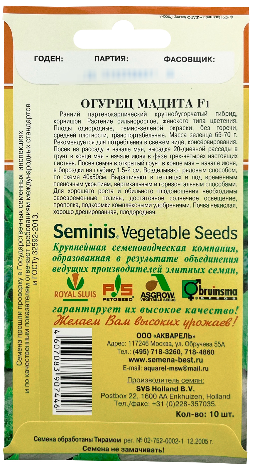 Огурец Мадита F1 АКВАРЕЛЬРанний партенокарпический крупнобугорчатый гибрид, корнишон. Растение сильнорослое, женского типа цветения. Плоды однородные, цилиндрической формы, темно-зеленой окраски, без горечи, средней плотности, транспортабельные. Масса зеленца 65-70 г. Рекомендуется для потребления в свежем виде, консервирования. Посев на рассаду в начале мая, высадка 20-дневной рассады в грунт в конце мая - начале июня в фазе трех-четырех настоящих листьев. Посев семян в открытый грунт в конце мая – начале июня, в бороздки на глубину 1,5-2 см. Возделывают рядовым способом, по схеме 40х50см. Выращивают в теплицах и под временным пленочным укрытием, вертикальным и горизонтальным способами. Для хорошего роста и обильного плодоношения необходимы своевременные поливы, достаточное солнечное освещение, прополка, подкормки комплексными удобрениями. Почва некислая, хорошо дренированная, плодородная.