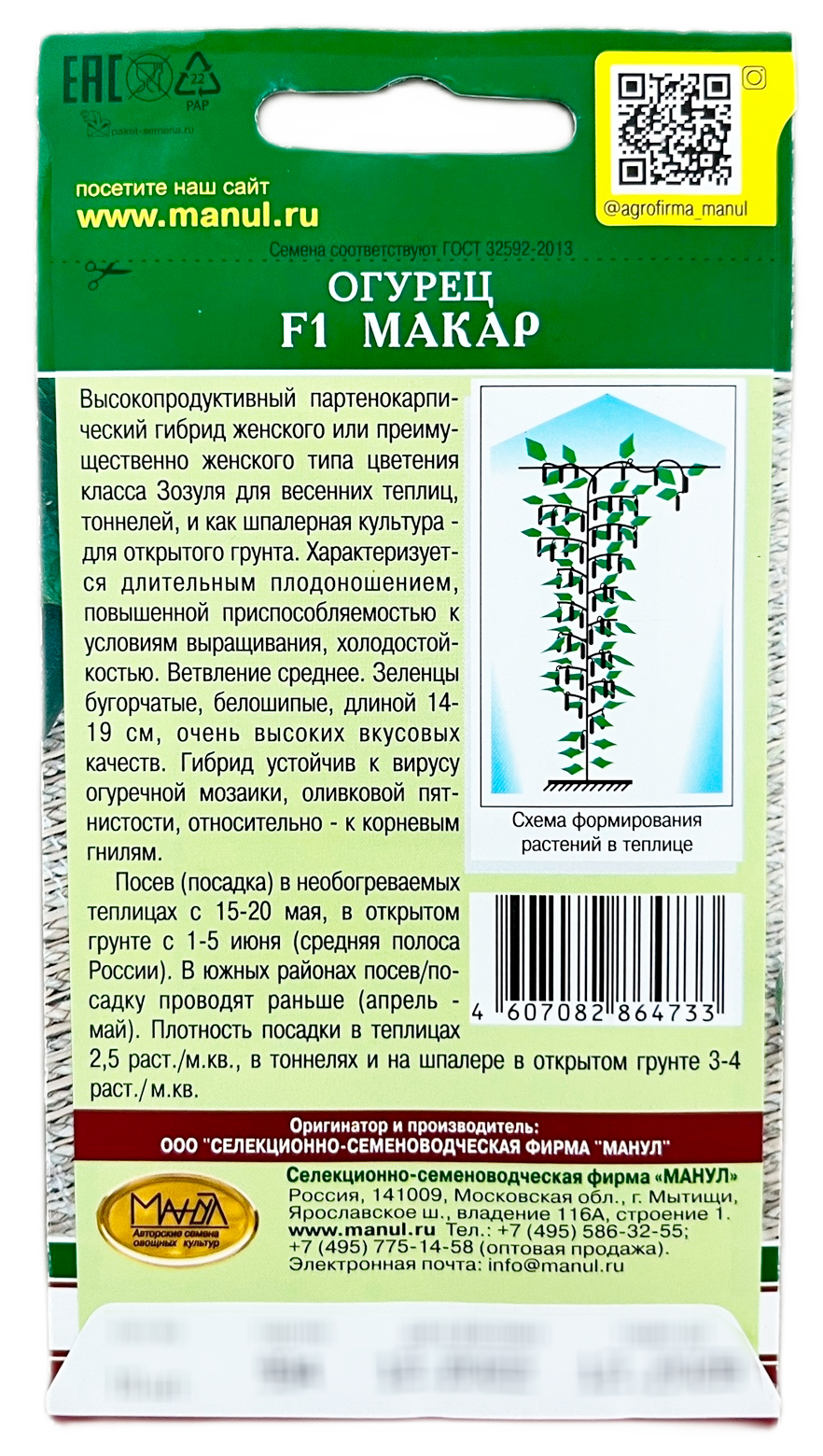 Огурец F1 МакарВысокопродуктивный партенокарпический гибрид женского или преимущественно женского типа цветения класса Зозуля для весенних теплиц и тоннелей. Характеризуется длительным плодоношением, холодостойкостью, повышенной приспособляемостью к условиям выращивания. Зеленцы бугорчатые, белошипые, длиной 14-19 см, салатного назначения. Гибрид устойчив к вирусу обыкновенной огуречной мозаики, оливковой пятнистости, относительно – к корневым гнилям. Плотность посадки в теплицах 2,5 раст./м2, в тоннелях до 3 раст./2, открытом грунте 3-4 раст./м2.