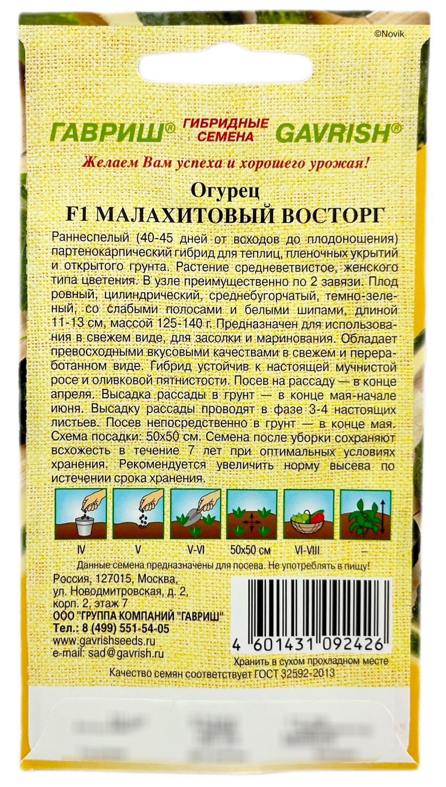 Огурец Малахитовый восторг F1 ГАВРИШРаннеспелый (40-45 дней от всходов до плодоношения), партенокарпический гибрид для теплиц, пленочных укрытий и открытого грунта. Растение средневетвистое, женского типа цветения. В узле преимущественно по 2 завязи. Плод ровный, цилиндрический, средне-бугорчатый, темно-зеленый, со слабыми полосами и белыми шипами, длинной 11-13 см, массой 125-140 г. Предназначен для использования в свежем виде, засолке и маринования. Обладает превосходными вкусовыми качествами в свежем и переработанном виде. Гибрид устойчив к настоящей мучнистой росе и оливковой пятнистости. Посев на рассаду — в конце апреля. Высадка рассады в грунт в конце мая–начале июня. Высадка рассады производится в фазе 3–4 настоящих листьев. Посев непосредственно в грунт — в конце мая. Схема посадки: 50х50 см. Семена после уборки сохраняют всхожесть в течение 7 лет при оптимальных условиях хранения. Рекомендуется увеличить норму высева по истечении срока хранения.