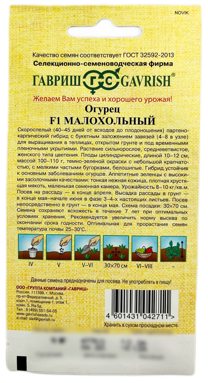 Огурец Малохольный F1 ГАВРИШСкороспелый (40-45 дней от всходов до плодоношения) партенокарпический гибрид с букетным заложением завязей (4-8 в узле) для выращивания в теплицах, открытом грунте и под временными пленочными укрытиями. Растение сильнорослое, средневетвистое, женского типа цветения. Плоды цилиндрические, длиной 10-12 см, массой 100-110 г, темно-зеленой окраски с небольшой крапчатостью, с мелкими частыми бугорками, белошипые. Гибрид устойчив к основным заболеваниям огурцов. Аппетитные зеленцы с высокими засолочными качествами: тонкой нежной кожицей, плотной хрустящей мякотью, маленькой семенной камерой. Урожайность 8-10 кг/м?. Посев на рассаду — в конце апреля. Высадка рассады в грунт в конце мая – начале июня в фазе 3-4-х настоящих листьев. Посев непосредственно в грунт – в конце мая. Схема посадки: 30х70 см.