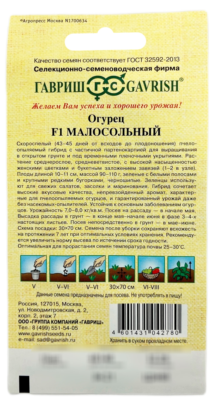 Огурец Малосольный F1 ГАВРИШСкороспелый (43-45 дней от всходов до плодоношения) пчелоопыляемый гибрид с частичной партенокарпией для выращивания в открытом грунте и под временными пленочными укрытиями. Растение среднерослое, средневетвистое, с высокой насыщенностью женскими цветками и букетным заложением завязей (1-2 в узле). Плоды длиной 10-11 см, массой 90-110 г, зеленые с белыми полосами и крупными редкими бугорками, черношипые. Зеленцы используют для свежих салатов, засолки и маринования. Гибрид сочетает высокие вкусовые качества, непревзойденный аромат, характерные для пчелоопыляемых огурцов, и гарантированный урожай даже без насекомых-опылителей. Устойчив к основным заболеваниям огурцов. Урожайность 7,0-8,0 кг/м2. Посев на рассаду — в начале мая. Высадка рассады в грунт в конце мая – начале июня в фазе 3-4-х настоящих листьев. Посев непосредственно в грунт – в мае – июне. Схема посадки 30х70 см.