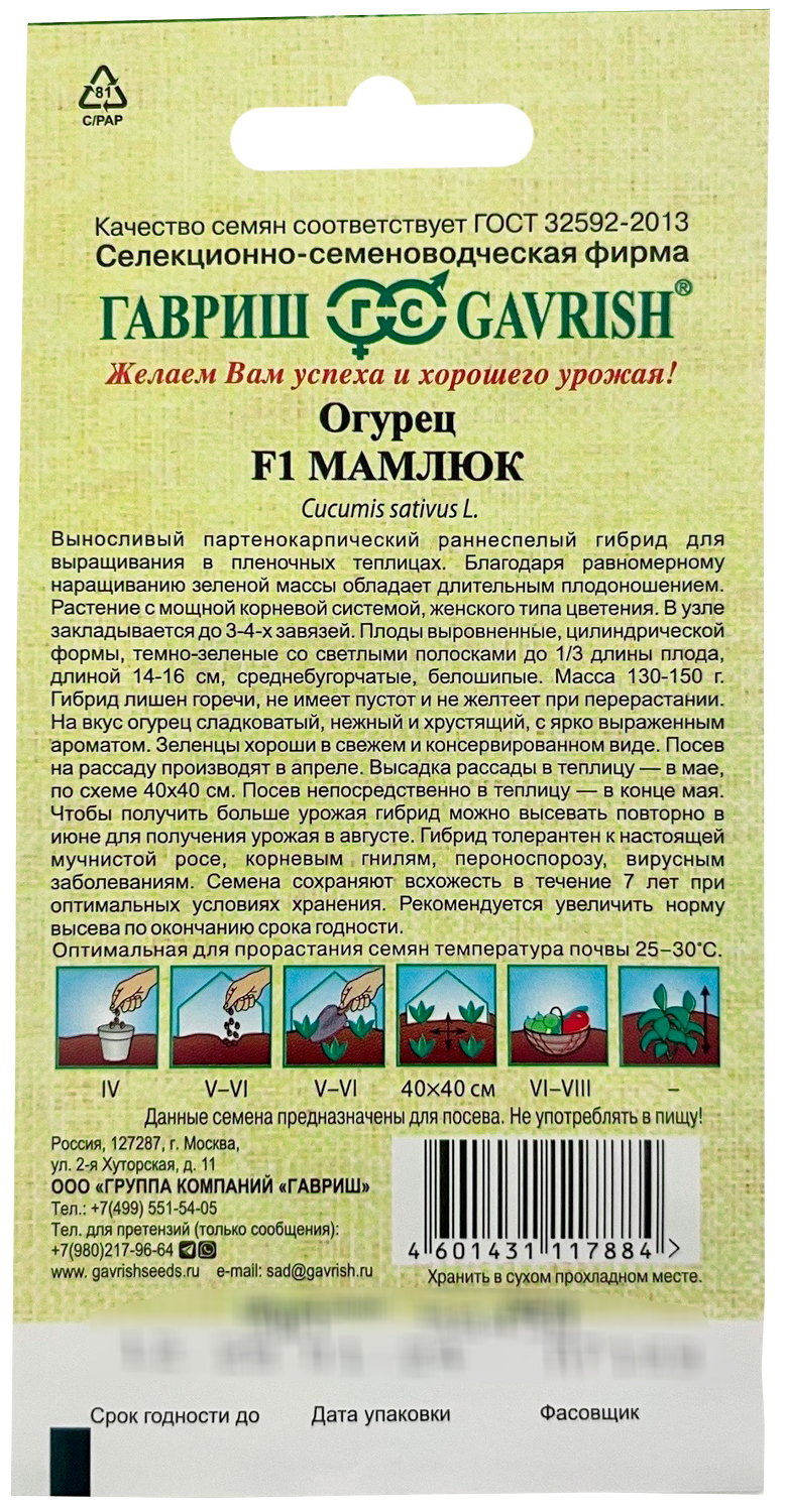 Огурец Мамлюк F1 ГАВРИШВыносливый партенокарпический раннеспелый гибрид для выращивания в пленочных теплицах. Благодаря равномерному наращиванию зеленой массы обладает длительным плодоношением. Растение с мощной корневой системой, женского типа цветения. В узле закладывается до 3-4-х завязей. Плоды выровненные, цилиндрической формы, темно-зеленые со светлыми полосками до 1/3 длины плода, длиной 14-16 см, среднебугорчатые, белошипые. Масса 130-150 г. Гибрид лишен горечи, не имеет пустот и не желтеет при перерастании. На вкус огурец сладковатый, нежный и хрустящий, с ярко выраженным ароматом. Зеленцы хороши в свежем и консервированном виде. Посев на рассаду производят в апреле. Высадка рассады в теплицу — в мае, по схеме 40х40 см. Посев непосредственно в теплицу — в конце мая. Чтобы получить больше урожая гибрид можно высевать повторно в июне для получения урожая в августе. Гибрид толерантен к настоящей мучнистой росе, корневым гнилям, пероноспорозу, вирусным заболеваниям. Семена сохраняют всхожесть в течение 7 лет при оптимальных условиях хранения. Рекомендуется увеличить норму высева по окончанию срока годности.