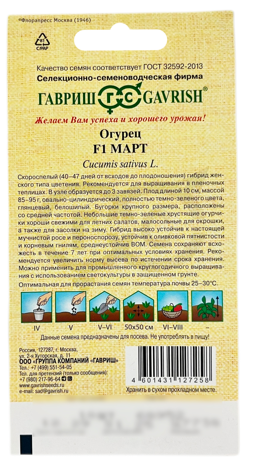 Огурец F1 МАРТ ГАВРИШСкороспелый (40-47 дней от всходов до плодоношения) гибрид женского типа цветения. Рекомендуется для выращивания в пленочных теплицах. В узле образуется до 3 завязей. Плод длиной 10 см, массой 85-95 г, овально-цилиндрический, полностью темно-зеленого цвета, глянцевый, белошипый. Бугорки крупного размера, расположены со средней частотой. Небольшие темно-зеленые хрустящие огурчики хороши свежими для летних салатов, малосольные для окрошки, а также для засолки на зиму. Гибрид высоко устойчив к настоящей мучнистой росе и пероноспорозу, устойчив к оливковой пятнистости и корневым гнилям, среднеустойчив ВОМ. Семена сохраняют всхожесть в течение 7 лет при оптимальных условиях хранения. Рекомендуется увеличить норму высева по истечении срока хранения. Можно применить для промышленного круглогодичного выращивания с использованием светокультуры в защищенном грунте.