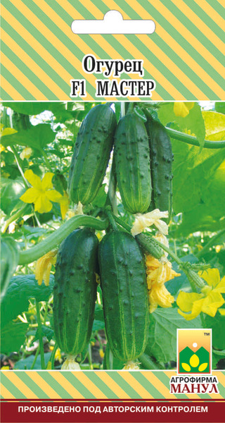 Огурец F1 Мастер — скороспелый партенокарпический пучковый корнишонный гибрид женского типа цветения. Предназначен для возделывания в весенне-летнем обороте в защищенном и открытом грунте. Ветвление ослаблено (растения формируют многочисленные боковые побеги с ограниченным ростом). В узлах формируется от 2-3 до 5-6 завязей. Зеленцы бугорчатые, белошипые, овально-цилиндрической формы, длиной 10-12 см, диаметром 2,6-3,5 см, массой 80-110 гр., Плотность посадки в теплицах 2,5-3 раст./м2, в открытом грунте 3-5 раст./м2.Характеристики