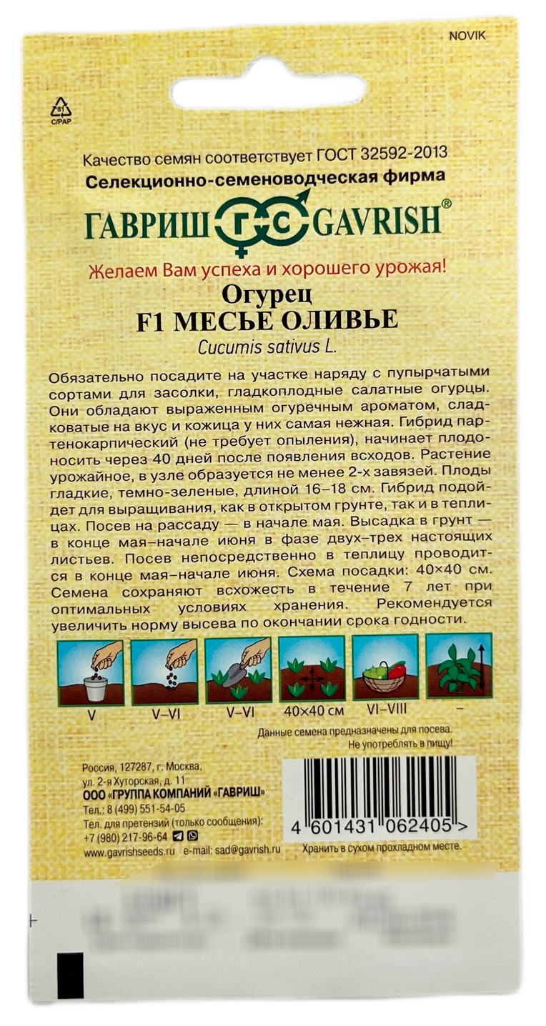 Огурец Месье Оливье салатный F1Обязательно посадите на участке наряду с пупырчатыми сортами для засолки, гладкоплодные салатные огурцы. Они обладают выраженным огуречным ароматом, сладковатые на вкус и кожица у них самая нежная. Гибрид партенокарпический (не требует опыления), начинает плодоносить через 40 дней после появления всходов. Растение урожайное, в узле образуется не менее 2-х завязей. Плоды гладкие, темно-зеленые, длиной 16-18 см. Гибрид подойдет для выращивания, как в открытом грунте, так и в теплицах. Посев на рассаду - в начале мая. Высадка в грунт - в конце мая - начале июня в фазе двух-трех настоящих листьев. Посев непосредственно в теплицу проводится в конце мая – начале июня. Схема посадки: 40х40 см. Оптимальная для прорастания семян температура почвы 25-30 °С.