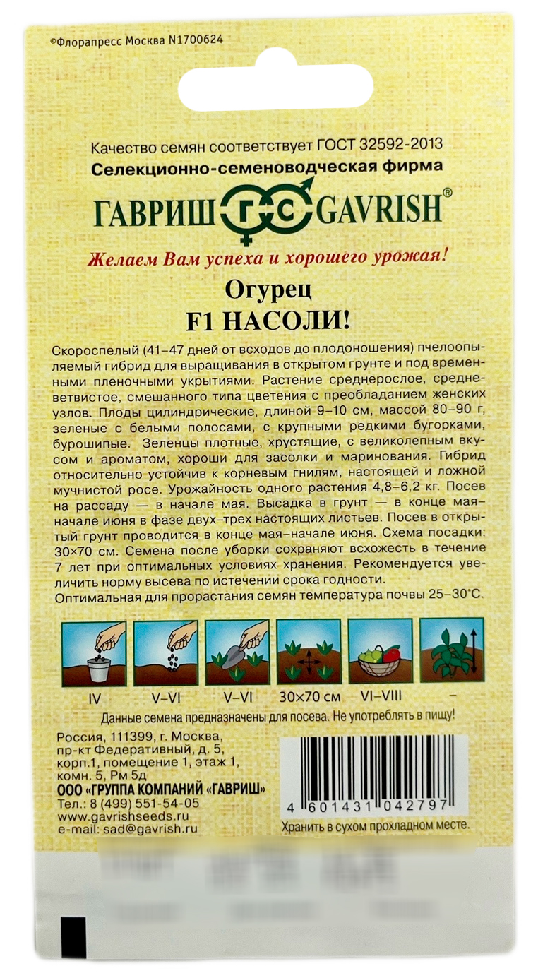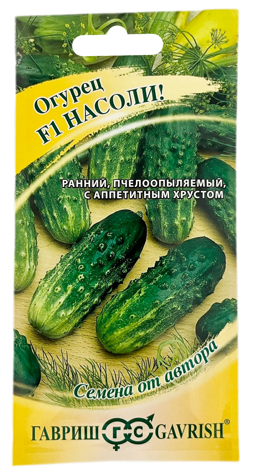 Огурец Насоли! F1 ГАВРИШСкороспелый (41-47 дней от всходов до плодоношения) пчелоопыляемый гибрид для выращивания в открытом грунте и под временными пленочными укрытиями. Растение среднерослое, средневетвистое, смешанного типа цветения с преобладанием женских узлов. Плоды цилиндрические, длиной 9-10 см, массой 80-90 г, зеленые с белыми полосами, с крупными редкими бугорками, бурошипые. Зеленцы плотные, хрустящие, с великолепным вкусом и ароматом, хороши для засолки и маринования. Гибрид относительно устойчив к корневым гнилям, настоящей и ложной мучнистой росе. Урожайность одного растения 4,8-6,2 кг. Посев на рассаду — в начале мая. Высадка в грунт — в конце мая – начале июня в фазе двух-трех настоящих листьев. Посев в открытый грунт проводится в конце мая – начале июня. Схема посадки: 30х70 см.