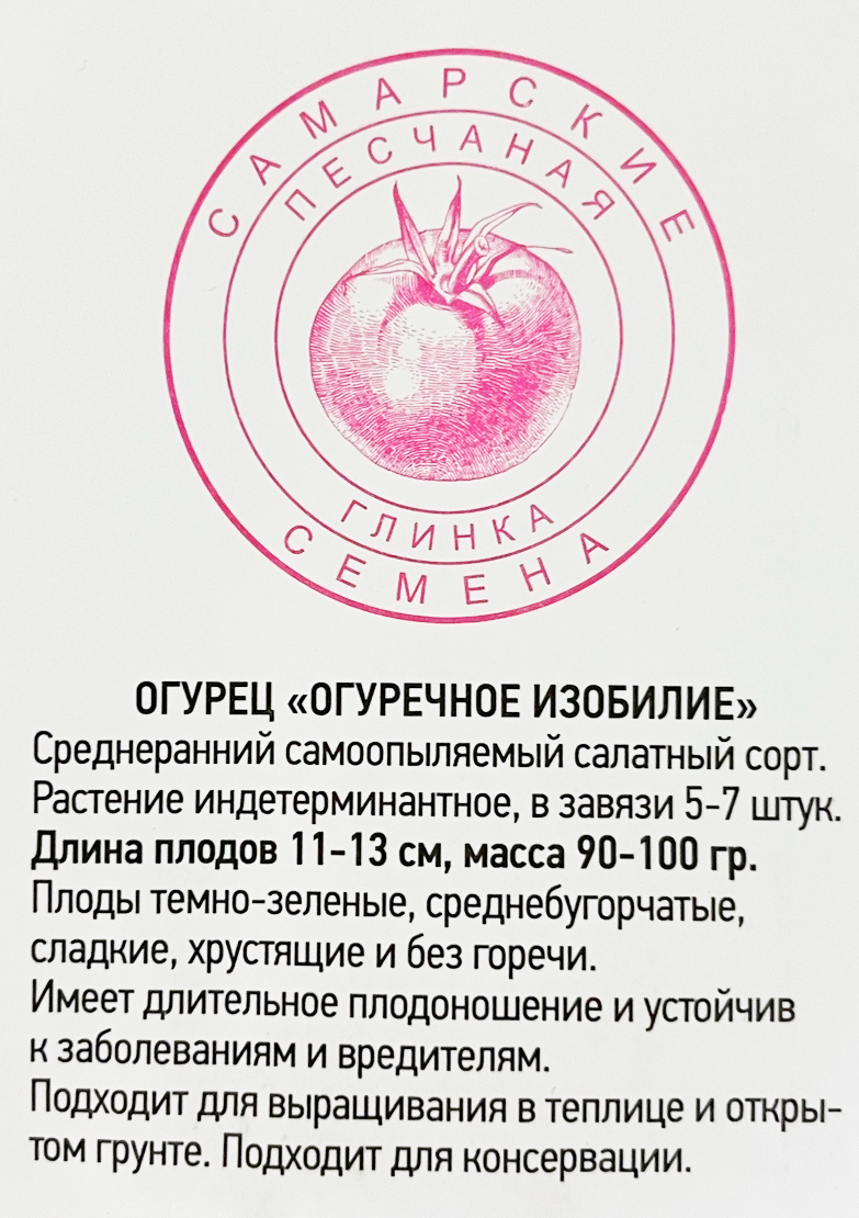 Огурец Огуречное изобилиеВысокоурожайный раннеспелый сорт огурцов. Зеленцы длиной до 13 см, неколючие, сладкие,ароматные, плотные. В завязи 5-7 огурцов. Подходит для теплицы и открытого грунта. Идеален для консервации, салатов.