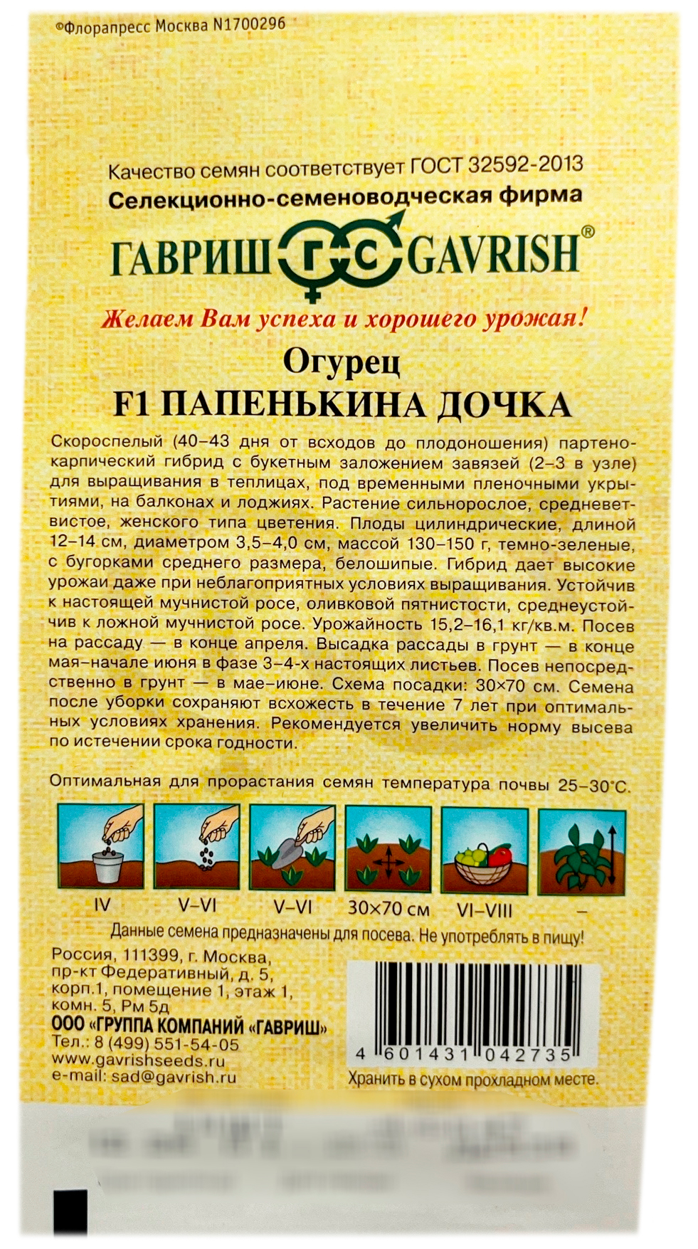 Огурец Папенькина дочка F1 ГАВРИШСкороспелый (40-43 дня от всходов до плодоношения) партенокарпический гибрид с букетным заложением завязей (2-3 в узле) для выращивания в теплицах, под временными пленочными укрытиями, на балконах и лоджиях. Растение сильнорослое, средневетвистое, женского типа цветения. Плоды цилиндрические, длиной 12-14 см, диаметром 3,5-4,0 см, массой 130-150 г, темно-зеленые, с бугорками среднего размера, белошипые. Гибрид дает высокие урожаи даже при неблагоприятных условиях выращивания. Устойчив к настоящей мучнистой росе, оливковой пятнистости, среднеустойчив к ложной мучнистой росе. Урожайность 15,2-16,1 кг/м2. Посев на рассаду — в конце апреля. Высадка рассады в грунт — в конце мая – начале июня в фазе 3-4-х настоящих листьев. Посев непосредственно в грунт – в мае – июне. Схема посадки: 30х70 см.