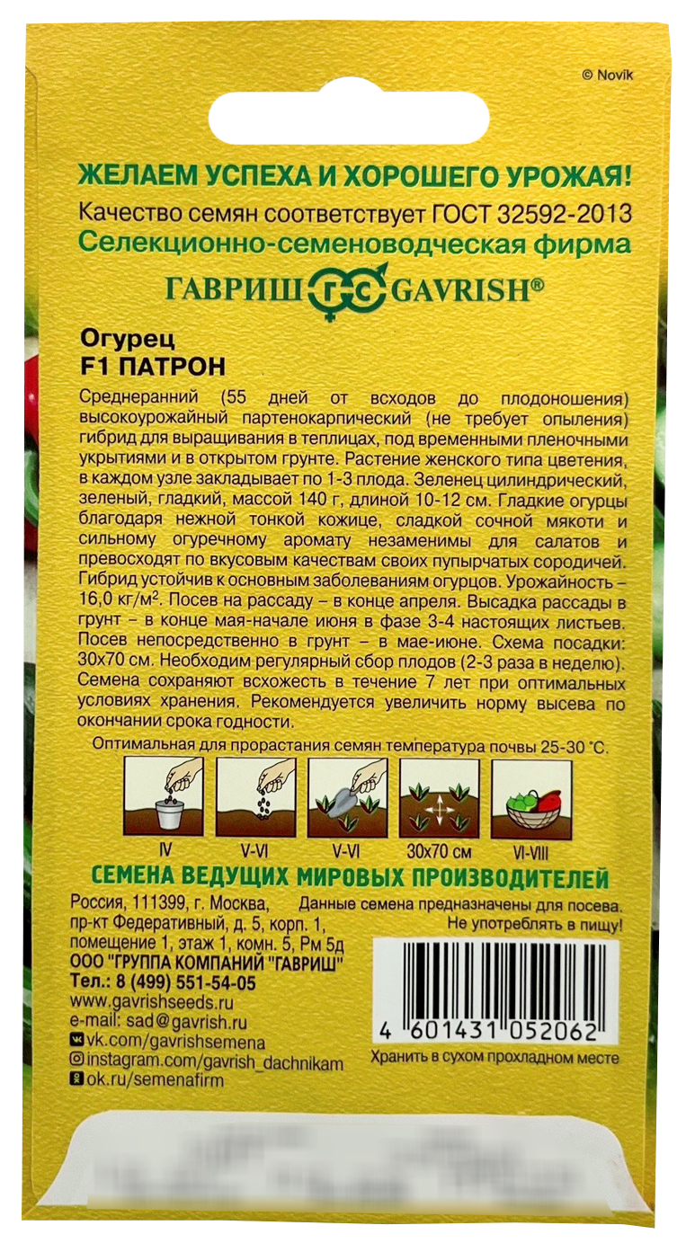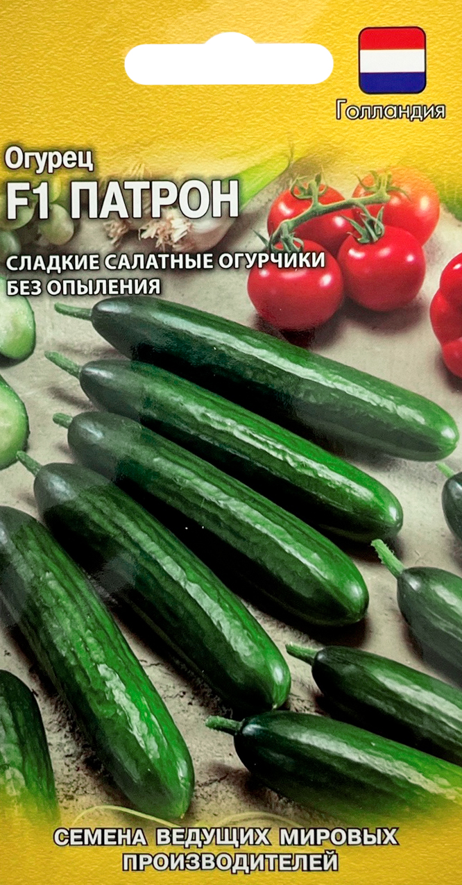 Огурец Патрон F1Среднеранний (55 дней от всходов до плодоношения) высокоурожайный партенокарпический (не требует опыления) гибрид для выращивания в теплицах, под временными пленочными укрытиями и в открытом грунте. Растение женского типа цветения, в каждом узле закладывает по 1-3 плода. Зеленец цилиндрический, зеленый, гладкий, массой 140 г, длиной 10-12 см. Гладкие огурцы благодаря нежной тонкой кожице, сладкой сочной мякоти и сильному огуречному аромату незаменимы для салатов и превосходят по вкусовым качествам своих пупырчатых сородичей. Гибрид устойчив к основным заболеваниям огурцов. Урожайность 16,0 кг/м²,. Посев на рассаду в конце апреля. Высадка рассады в грунт в конце мая &ndash, начале июня в фазе 3-4-х настоящих листьев. Посев непосредственно в грунт &ndash, в мае &ndash, июне. Схема посадки: 30х70 см. Необходим регулярный сбор плодов (2-3 раза в неделю).