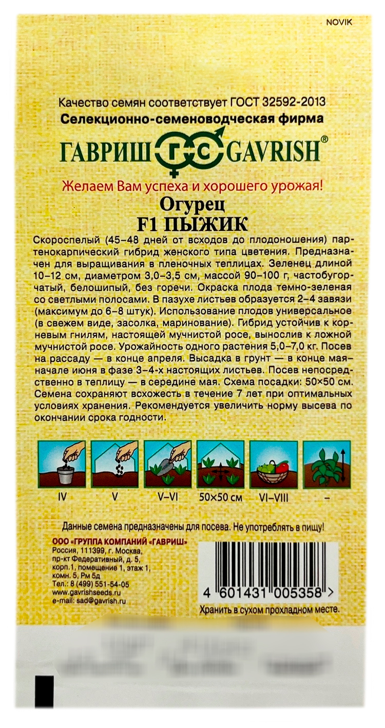 Огурец ПЫЖИК F1 ГАВРИШНовый скороспелый партенокарпический гибрид огурца (45-48 дней от всходов до плодоношения), женского типа цветения, предназначен для выращивания в пленочных теплицах. Растение сильнорослое, длина главного побега до 3,0-3,5 м. В узлах формируется по 2-4 завязи (до 6-8 штук). Зеленец длиной 10-12 см, диаметром 3,0-3,5 см, массой 90-110 г, бугорчатый. Окраска плода темно-зеленая со светлыми полосами, белошипый. Вкусовые качества плодов высокие, использование универсальное. Гибрид устойчив к корневым гнилям, настоящей мучнистой росе, вынослив к ложной мучнистой росе. Плотность посадки 2,5-3,0 раст/м2. Урожайность 6-8 кг/раст.