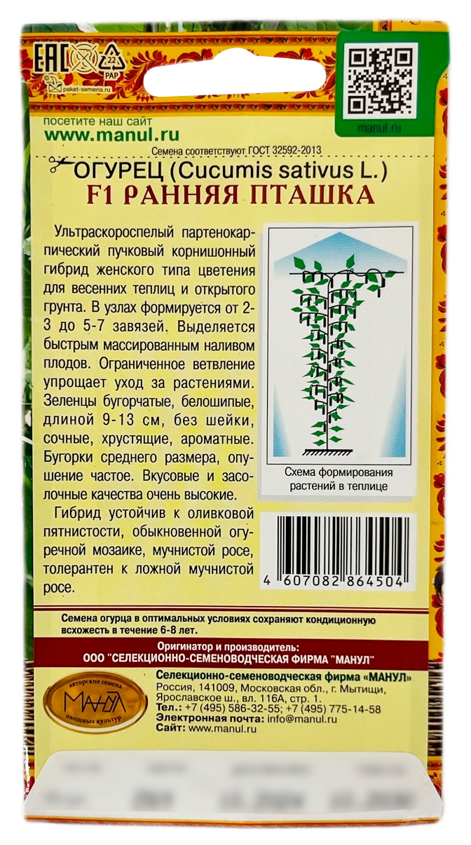 Огурец РАННЯЯ ПТАШКА МАНУЛУльтраскороспелый партенокарпический пучковый корнишон для весенних теплиц и открытого грунта. Растения женского типа цветения с ограниченным ветвлением. В узлах формируется от 2-3 до 5-7 завязей. На боковых побегах пучковость выражена сильнее, чем на главном стебле. Стартовая партенокарпия высокая. Зеленцы бугорчатые, белошипые, ярко-зеленые, с глянцевой поверхностью, длиной 9-13 см, диаметром 3,1-4,0 см, массой 80-120 г., цилиндрической формы, без шейки, сочные, хрустящие, ароматные. Бугорки среднего размера, опушение частое. На зеленцах характерно наличие светлых продольных полос средней длины. Вкусовые и засолочные качества очень высокие.
