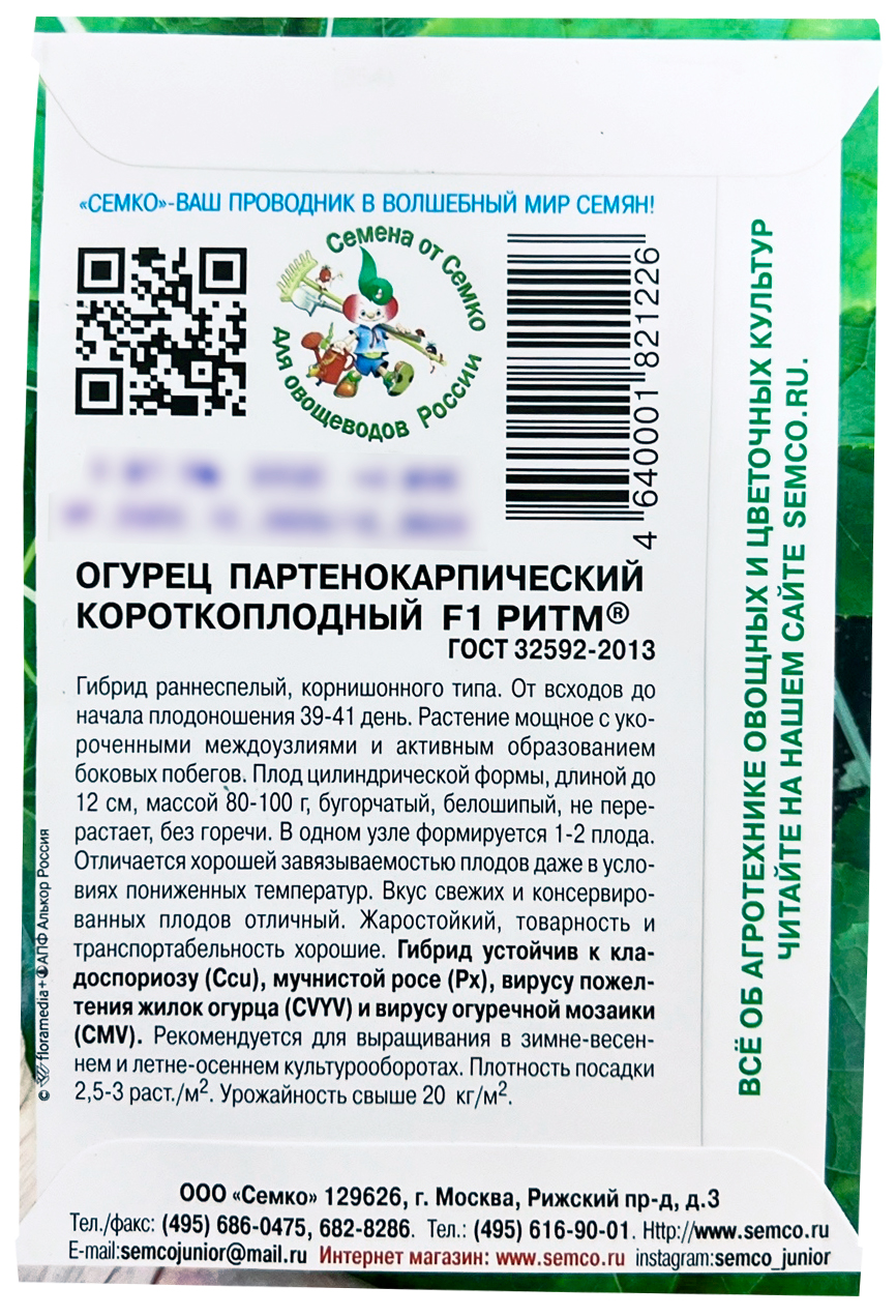 Огурец Ритм F1 СЕМКОРанний партенокарпический гибрид для защищенного и открытого грунта. От всходов до начала плодоношения 39–41 день. Растение мощное с укороченными междоузлиями и активным образованием боковых побегов. Плоды цилиндрической формы, длиной до 12 см, массой 80–100 г, бугорчатые, белошипые, не перерастают, без горечи. В одном узле формирует 1–2 плода. Отличается хорошей завязываемостью плодов даже в условиях пониженных температур. Вкусовые качества свежих и консервированных плодов отличные. Жаростойкий, товарность и транспортабельность хорошие. Огурец Ритм F1 устойчив к кладоспориозу (Ccu), мучнистой росе (Px), вирусу пожелтения жилок огурца (CVYV) и вирусу огуречной мозаики (CMV). Рекомендуется для выращивания в зимне-весеннем и летне-осеннем культурооборотах. Используется для свежего потребления и консервирования. Плотность посадки 2,5–3 раст./м2. Урожайность в защищенном грунте свыше 20 кг/м2.