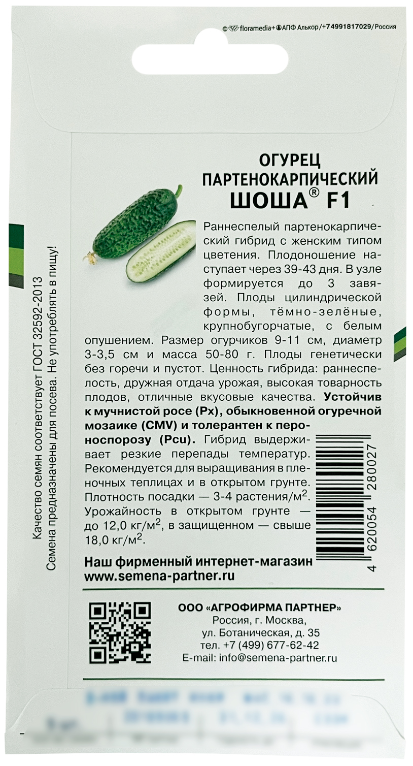Огурец Шоша F1Раннеспелый партенокарпический гибрид с женским типом цветения. Плодоношение наступает через 39-43 дня. В узле формируется до 3-х завязей. Плоды цилиндрической формы, тёмно-зелёные, крупнобугорчатые, с белым опушением. Размер огурчиков 9-11см, диаметр 3-3,5см и масса 50-80 г. Плоды генетически без горечи и пустот. Ценность гибрида: раннеспелость, дружная отдача урожая, высокая товарность плодов, отличные вкусовые качества. Устойчив к мучнистой росе, обыкновенной огуречной мозаике и толерантен к пероноспорозу. Гибрид выдерживает резкие перепады температур. Рекомендуется для пленочных теплиц и открытого грунта. Плотность посадки 3-4 растений/м². Урожайность в открытом грунте до 12,0 кг/м², в защищенном - свыше 18,0 кг/м².