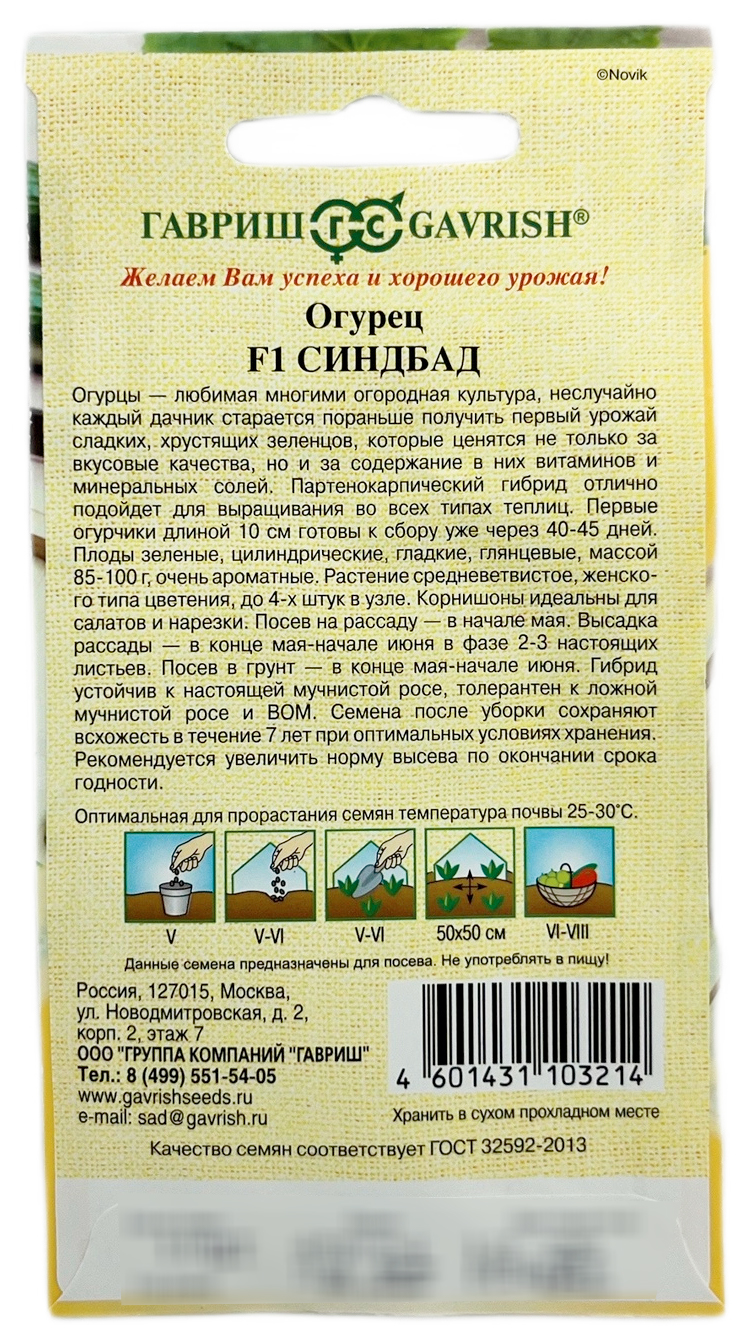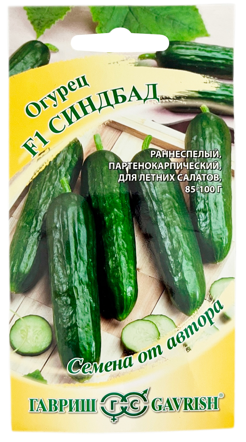 Огурец Синдбад F1 ГАВРИШОгурцы — любимая многими огородная культура, неслучайно каждый дачник старается пораньше получить первый урожай сладких, хрустящих зеленцов, которые ценятся не только за вкусовые качества, но и за содержание в них витаминов и минеральных солей. Партенокарпический гибрид отлично подойдет для выращивания в всех типах теплиц. Первые огурчики длиной 10 см готовы к сбору уже через 40-45 дней. Плоды зеленые, цилиндрические, гладкие, глянцевые, массой 85-100 г, очень ароматные. Растение средневетвистое, женского типа цветения, до 4-х штук в узле. Корнишоны идеальны для салатов и нарезки. Посев на рассаду — в начале мая. Высадка рассады — в конце мая-начале июня в фазе 2-3-х настоящих листьев. Посев в грунт — в конце мая-начале июня. Гибрид устойчив к настоящей мучнистой росе, толерантен к ложной мучнистой росе и ВОМ. Семена после уборки сохраняют всхожесть в течение 7 лет при оптимальных условиях хранения. Рекомендуется увеличить норму высева по окончании срока годности.