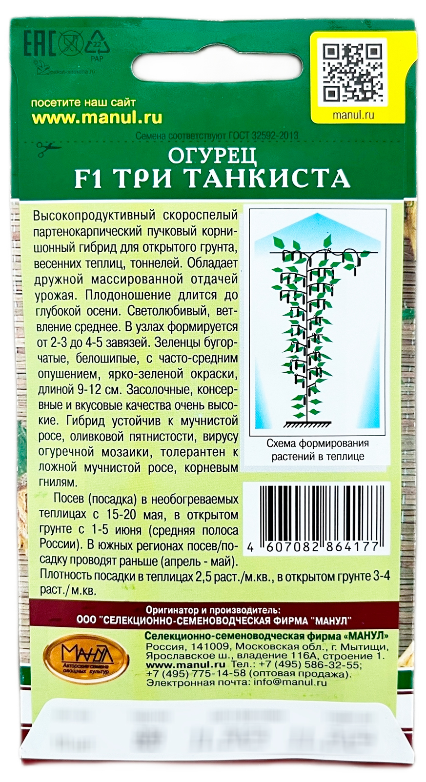Огурец F1 Три танкиста МАНУЛВысокопродуктивный скороспелый партенокарпический пучковый корнишонный гибрид для открытого грунта, весенних теплиц, тоннелей. Обладает дружной массированной отдачей урожая. Плодоношение длится до глубокой осени. Светолюбивый, ветвление среднее. В узлах формируется от 2-3 до 4-5 завязей. Зеленцы бугорчатые, белошипые, с часто-средним опушением, ярко-зеленой окраски, длиной 9-12 см. Засолочные, консервные и вкусовые качества очень высокие. Гибрид устойчив к мучнистой росе, оливковой пятнистости, вирусу обыкновенной огуречной мозаики, толерантен к ложной мучнистой росе, корневым гнилям. Плотность посадки в теплицах 2,5 раст./м2, в открытом грунте 3-4 раст./м2.