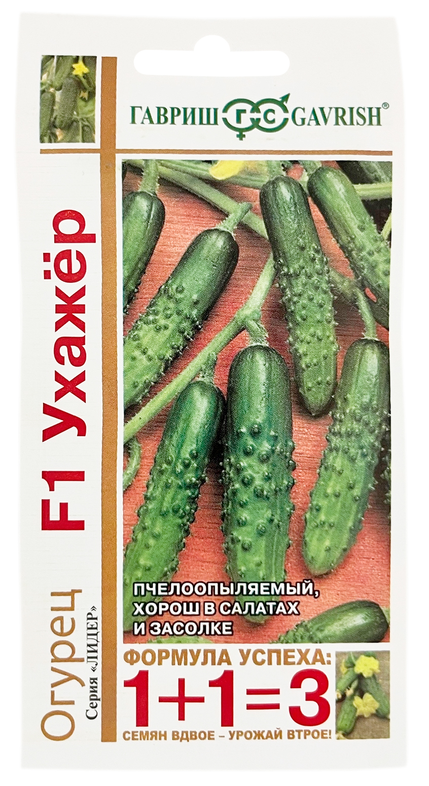 Огурец F1 УХАЖЁР 1+1 ГАВРИШНовый среднепоздний пчелоопыляемый гибрид (от всходов до плодоношения 55-60 дней), предназначен для выращивания в пленочных теплицах. Благодаря высокой насыщенности мужскими цветками, его можно использовать в качестве опылителя при подсадке к пчелоопыляемым гибридам с преимущественно женским типом цветения. Растение мощное, побегообразовательная способность средняя, лист крупный, темно-зеленый. Зеленец длиной 18-20 см, массой 180-200 г, крупнобугорчатый, белошипый. Вкусовые качества отличные. Плотность посадки 2,5 раст/м2. Урожайность 5-6 кг/раст.