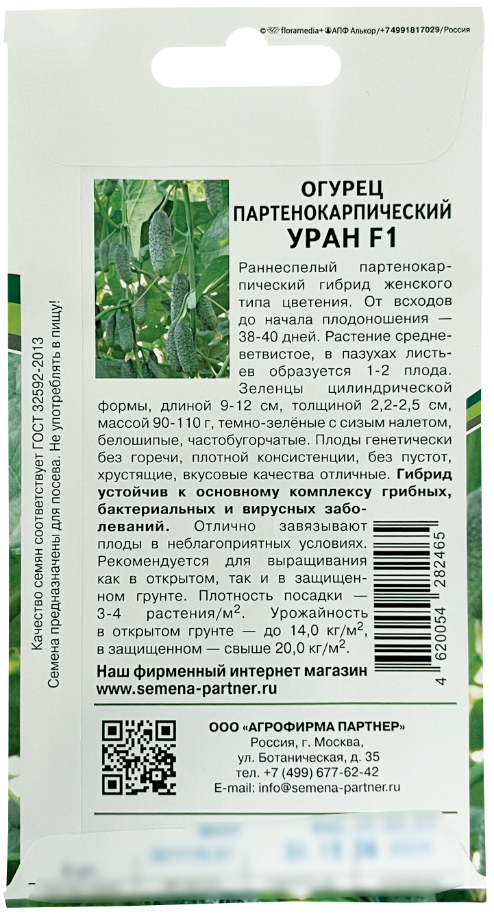Огурец Уран F1Гибрид раннеспелый, партенокарпический. От всходов до начала плодоношения 38-40 дней. Растение средневитвистое, с букетным типом образования плодов, 3-4 завязи в пазухе листа. Зеленцы цилиндрической формы, длиной 9-12см, толщиной 2,2-2,5см, массой 60-80 г, темно-зелёные с сизым налетом, белошипые, частобугорчатые, Плоды генетически без горечи, плотной консистенции, без пустот, хрустящие, вкусовые качества отличные. Гибрид устойчив к основному комплексу грибных, бактериальных и вирусных заболеваний. Рекомендуется выращивать в защищенном и открытом грунте. Плотность посадки 3-3,5 растения/м2. Урожайность в открытом грунте до 14 кг/м2, в защищенном свыше 20 кг/м2.