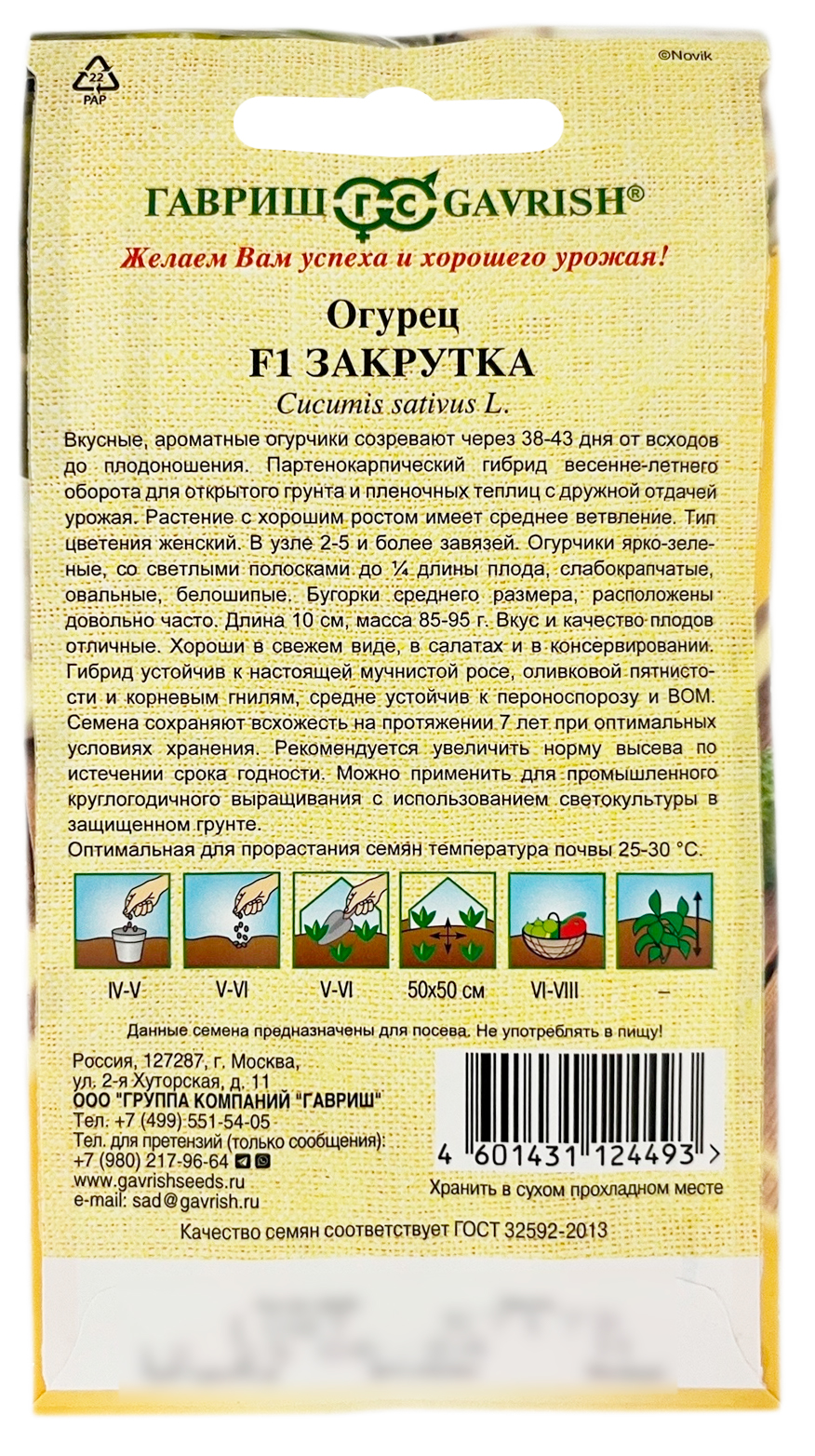 Огурец F1 ЗАКРУТКА ГАВРИШВкусные, ароматные огурчики созревают через 38–43 дня от всходов до плодоношения. Партенокарпический гибрид весенне-летнего оборота для открытого грунта и пленочных теплиц с дружной отдачей урожая. Растение с хорошим ростом имеет среднее ветвление. Тип цветения женский. В узле 2-5 и более завязей. Огурчики ярко-зеленые, со светлыми полосками до ¼ длины плода, слабо крапчатые, овальные, белошипые. Бугорки среднего размера, расположены довольно часто. Длина 10 см, масса 85-95 г. Вкус и качество плодов отличные. Хороши в свежем виде, в салатах и в консервировании. Гибрид устойчив к настоящей мучнистой росе, оливковой пятнистости и корневым гнилям, среднеустойчив к пероноспорозу и ВОМ. Семена сохраняют всхожесть на протяжении 7 лет при оптимальных условиях хранения. Рекомендуется увеличить норму высева по истечении срока годности. Можно применить для промышленного круглогодичного выращивания с использованием светокультуры в защищенном грунте.