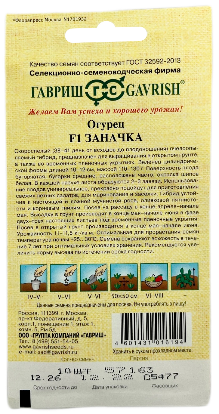 Огурец Заначка F1 ГАВРИШСкороспелый (38-41 день от всходов до плодоношения) пчелоопыляемый гибрид, предназначен для выращивания в пленочных теплицах, а также во временных пленочных укрытиях. Зеленец цилиндрической формы длиной 10-12 см, массой 110-130 г. Поверхность плода бугорчатая, бугорки средние, расположены часто, окраска шипов белая. В каждой пазухе листа образуется 2-3 завязи. Посев на рассаду в конце апреля – начале мая. Высадку в грунт производят в конце мая – начале июня в фазе двух-трех настоящих листьев под временные пленочные укрытия. Посев в открытый грунт производится в конце мая – в начале июня. Использование плодов универсальное, прекрасно подойдут для приготовления свежих летних салатов и для маринования и засолки. оливковой пятнистости и корневым гнилям. Урожайность 11-11,5 кг/м2 Оптимальная для прорастания семян температура почвы 25-30 °C.