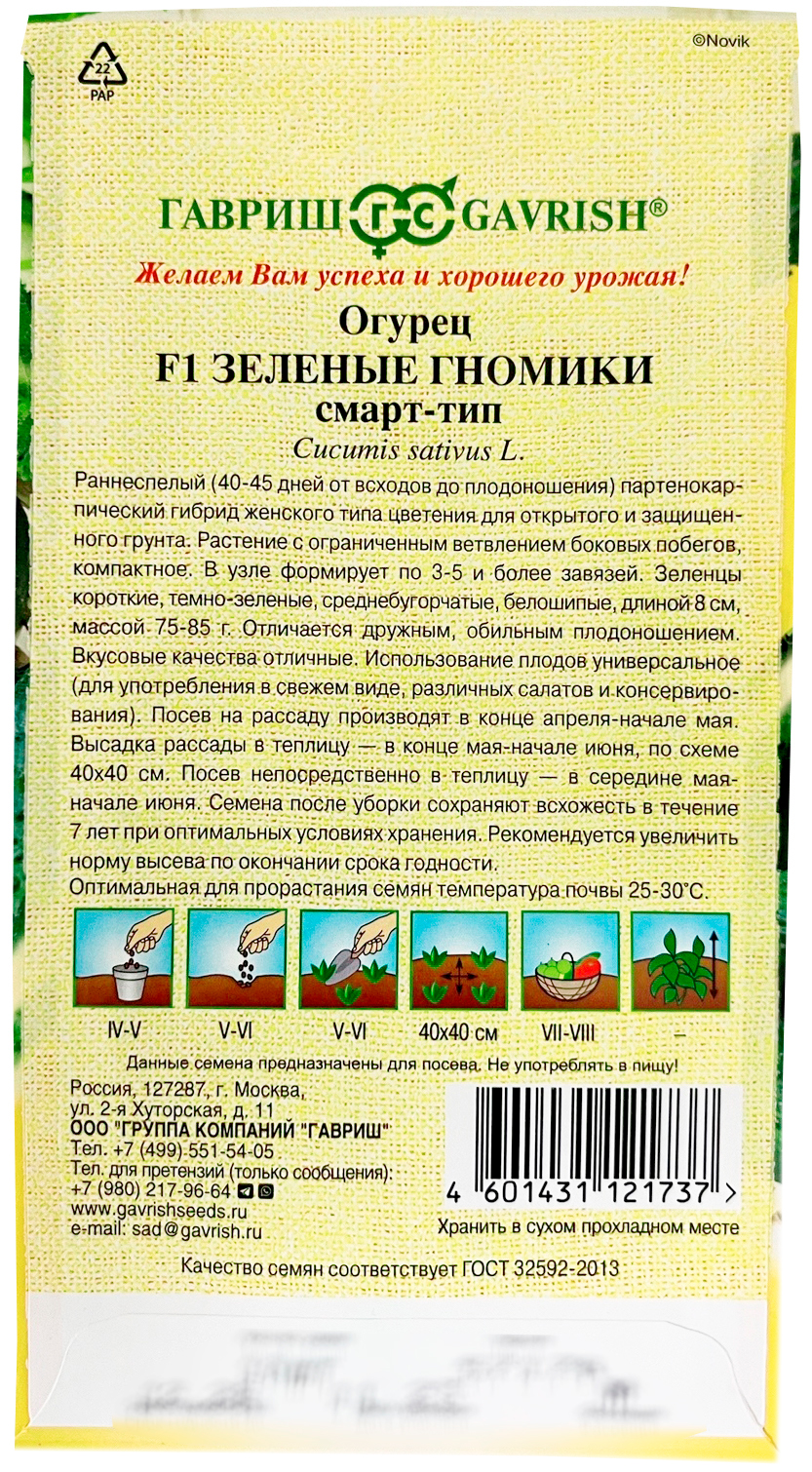 Огурец ЗЕЛЁНЫЕ ГНОМИКИ F1 смарт-тип ГАВРИШРаннеспелый (40-45 дней от всходов до плодоношения) партенокарпический гибрид женского типа цветения для открытого и защищенного грунта. Растение с ограниченным ветвлением боковых побегов, компактное. В узле формирует по 3-5 и более завязей. Зеленцы короткие темно-зеленые, среднебугорчатые. Белошипые длиной 8 см, массой 75-85 г. Отличается дружным, обильным плодоношением. Вкусовые качества отличные. Использование плодов универсальное (для употребления в свежем виде, различных салатов и консервирования).
