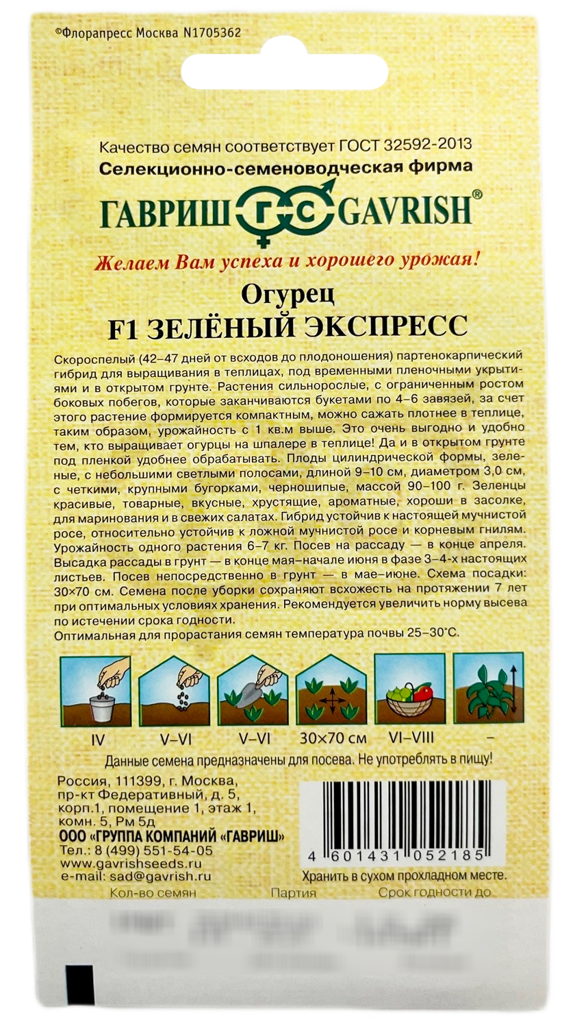 Огурец Зеленый экспресс F1 ГАВРИШСкороспелый (42-47 дней от всходов до плодоношения) партенокарпический гибрид для выращивания в теплицах, под временными пленочными укрытиями и в открытом грунте. Растения сильнорослые, с ограниченным ростом боковых побегов, которые заканчиваются букетами по 4-6 завязей, за счет этого растение формируется компактным, можно сажать плотнее в теплице, таким образом, урожайность с 1 м ² выше. Это очень выгодно и удобно тем, кто выращивает огурцы на шпалере в теплице! Да и в открытом грунте под пленкой удобнее обрабатывать. Плоды цилиндрической формы, зеленые, с небольшими светлыми полосами, длиной 9-10 см, диаметром 3,0 см, с четкими, крупными бугорками, черношипые, массой 90-100 г. Зеленцы красивые, товарные, вкусные, хрустящие, ароматные, хороши в засолке, для маринования и в свежих салатах. Гибрид устойчив к настоящей мучнистой росе, относительно устойчив к ложной мучнистой росе и корневым гнилям.