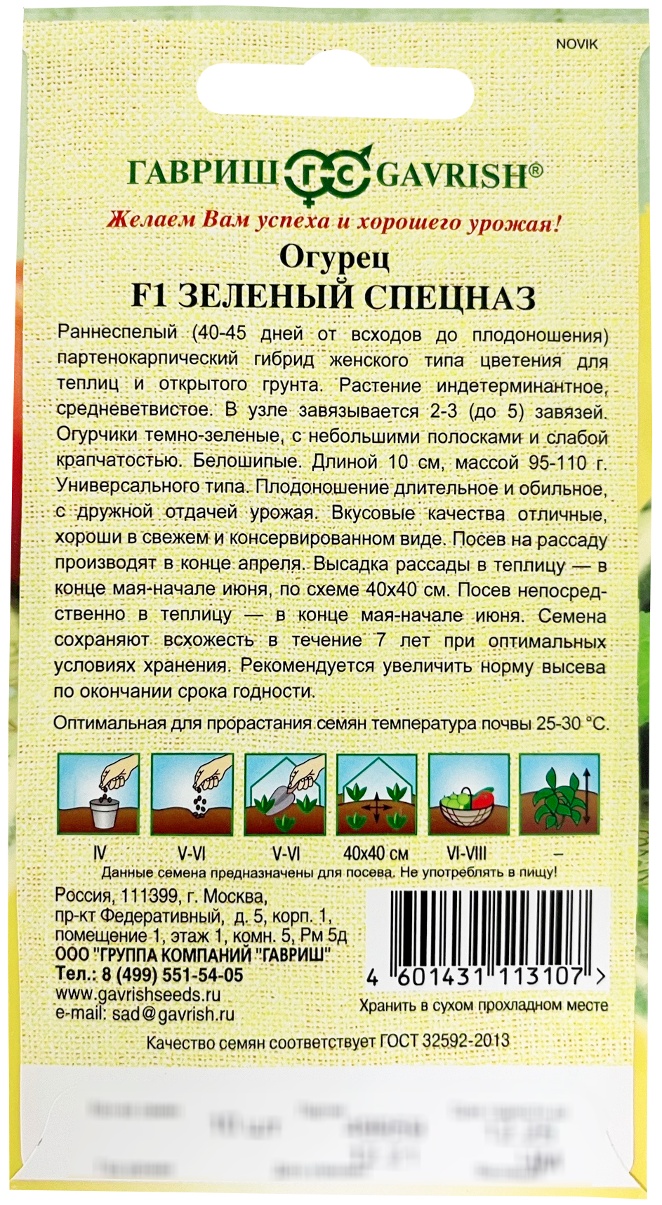 Огурец Зеленый спецназ F1 ГАВРИШРаннеспелый (40-45 дней от всходов до плодоношения) партенокарпический гибрид женского типа цветения для теплиц и открытого грунта. Растение индетерминантное, средневетвистое. В узле завязывается 2-3 (до 5) завязей. Огурчики темно-зеленые с небольшими полосками и слабой крапчатостью. Белошипые. Длиной 10 см, массой 95-110 г. Универсального типа. Плодоношение длительное и обильное с дружной отдачей урожая. Вкусовые качества отличные, хороши в свежем и консервированном виде. Посев на рассаду производят в конце апреля. Высадка рассады в теплицу — в конце мая-начале июня, по схеме 40х40 см. Посев непосредственно в теплицу — в мае -начале июня. Семена сохраняют всхожесть в течение 7 лет при оптимальных условиях хранения. Рекомендуется увеличить норму высева по окончанию срока годности.
